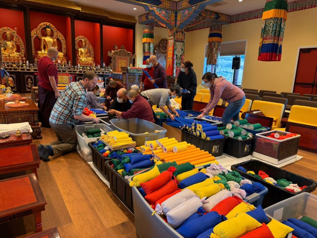 For the past year, the nuns of Samten Tse have been preparing much of the zung for the statues for Mindrol Gatsal. To prepare them, the dharanis are first washed with saffron water, cut, glued together and rolled into continuous rolls of unbroken mantras. Finally, they are adorned with cloths of the appropriate colors according to the mantra. The Samten Tse nuns prepared over 750 kg of zung which was shipped from India to the United States. This work was then continued in Lotus Garden, as further zung was prepared by the Mindrol Lekshey students under the supervision of our teachers and senior monks and nuns.