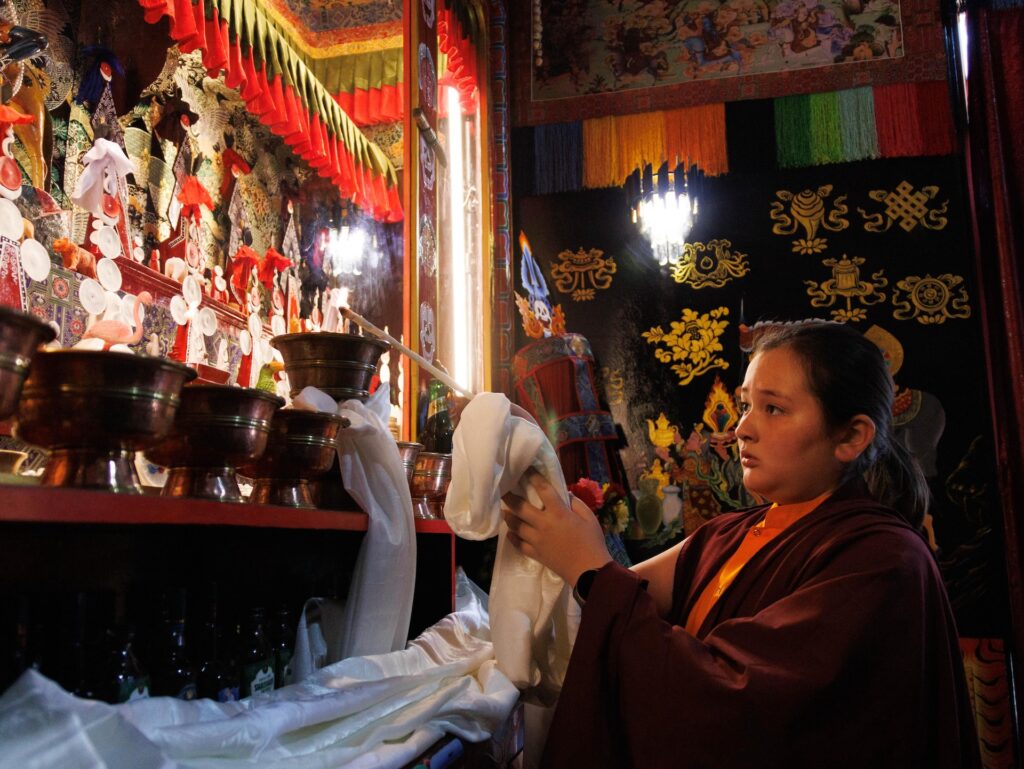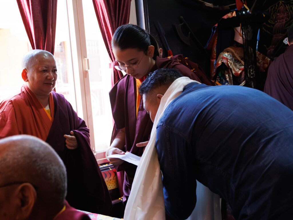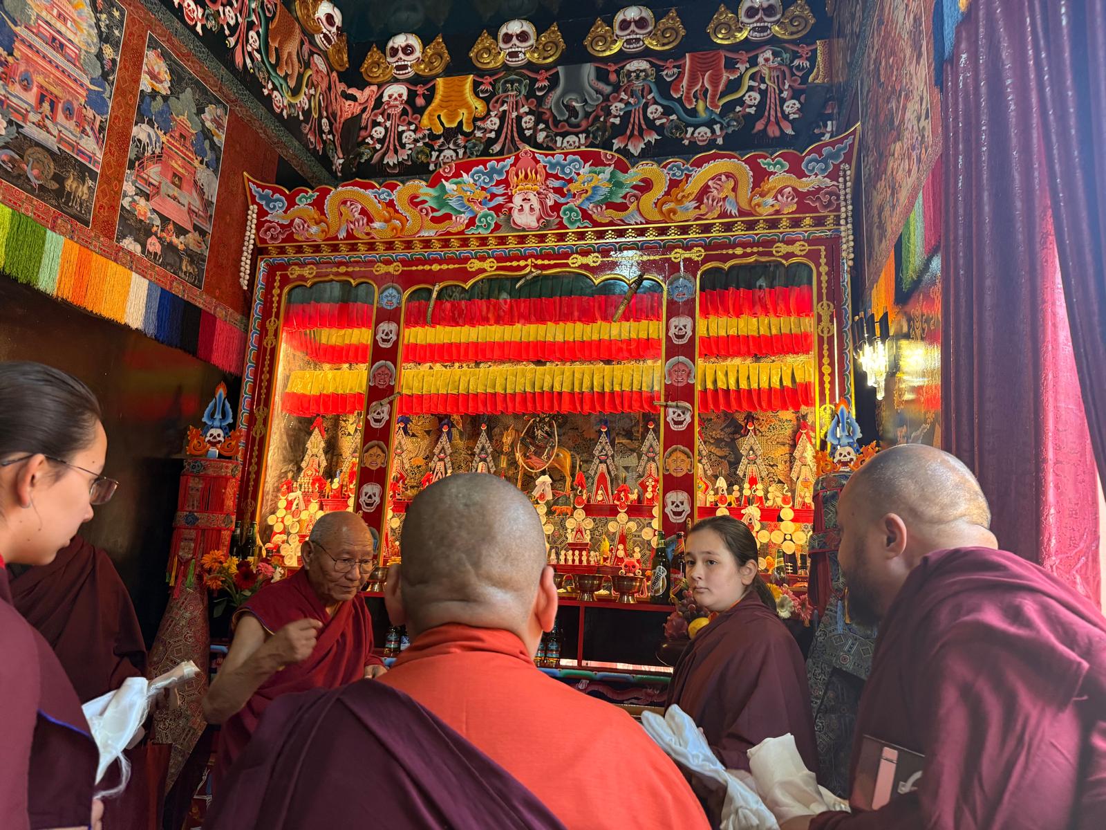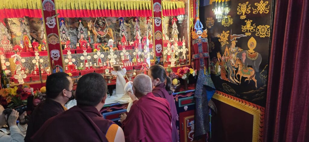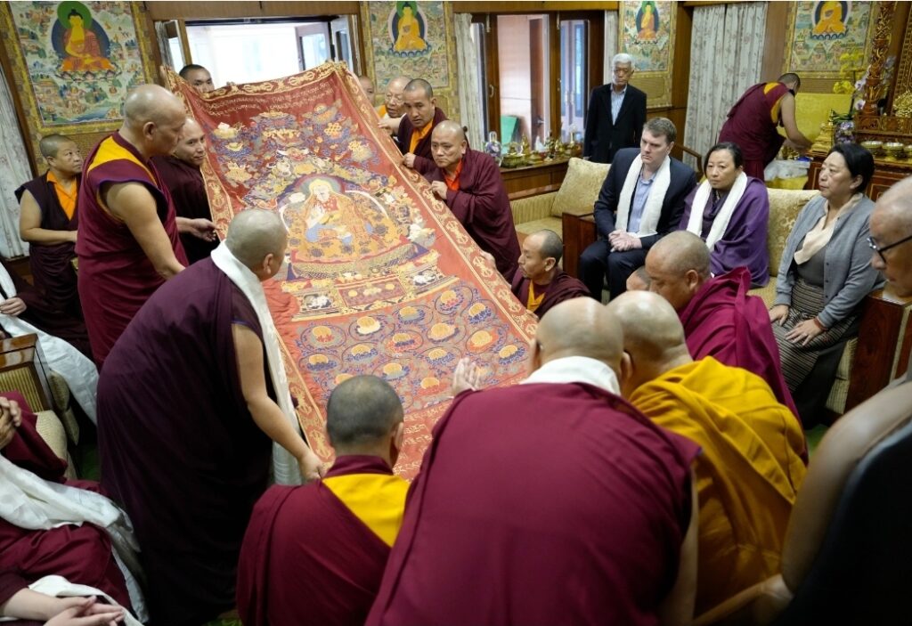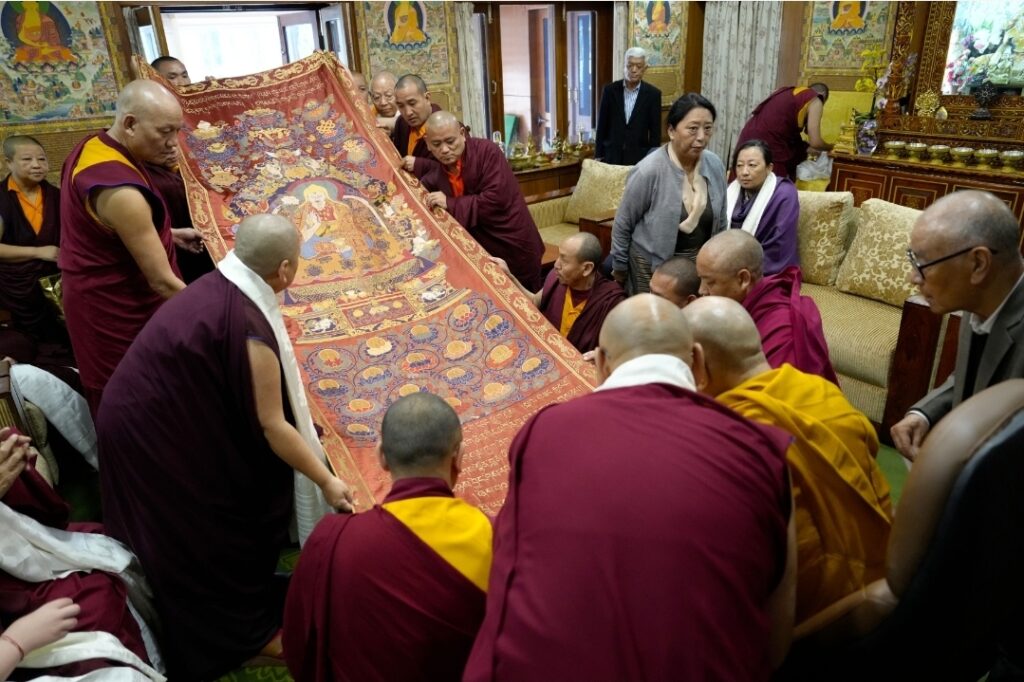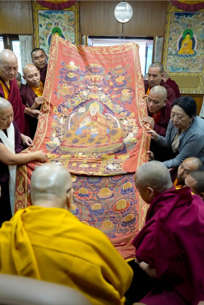 Among the offerings was a rare and precious thangka of the Great Fifth Dalai Lama, woven in silk over three centuries ago during the Qing dynasty. As one of the few remaining sacred representations of its kind, it was presented with deep reverence and joy, constituting a supreme tendrel, marking the return of a sacred image to its rightful sphere of devotion.
