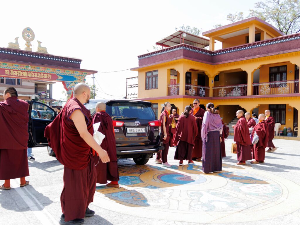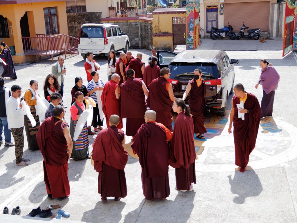 As a further auspicious tendrel, and as though to seal the blessings of this sacred occasion, a rare and fortunate encounter arose thereafter during the journey. By a most unexpected and serendipitous turn of circumstances, the Mindrolling family was further blessed to receive the blessings of His Holiness Kyabgön Sakya Gongma Trizin Rinpoche. Also present were the 42nd Kyabje Sakya Trizin Ratna Vajra Rinpoche and Sakya Gyalyum Chenmo.