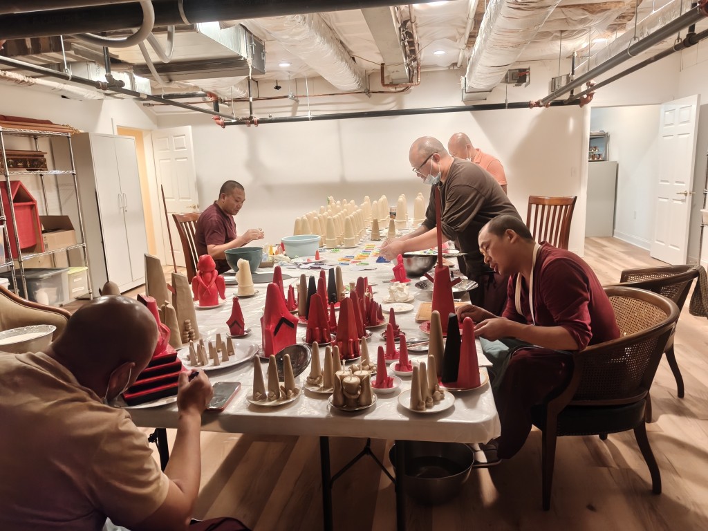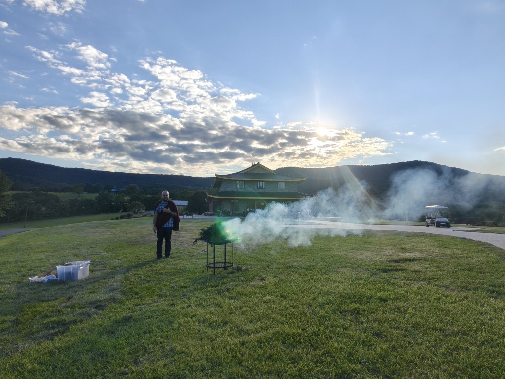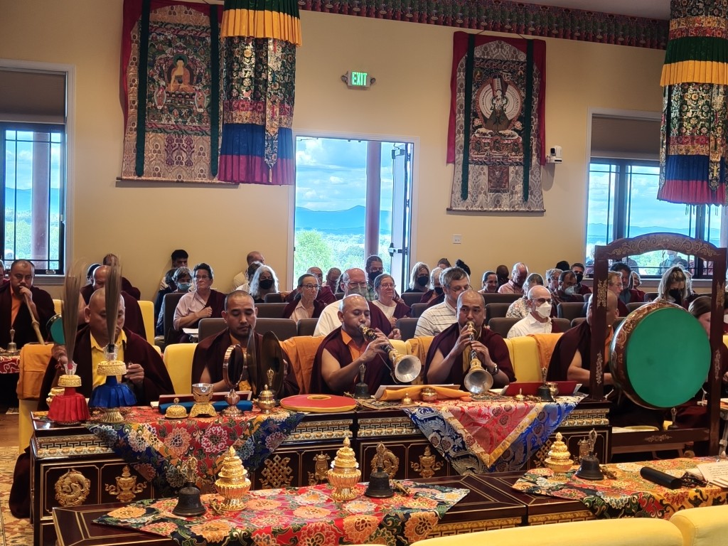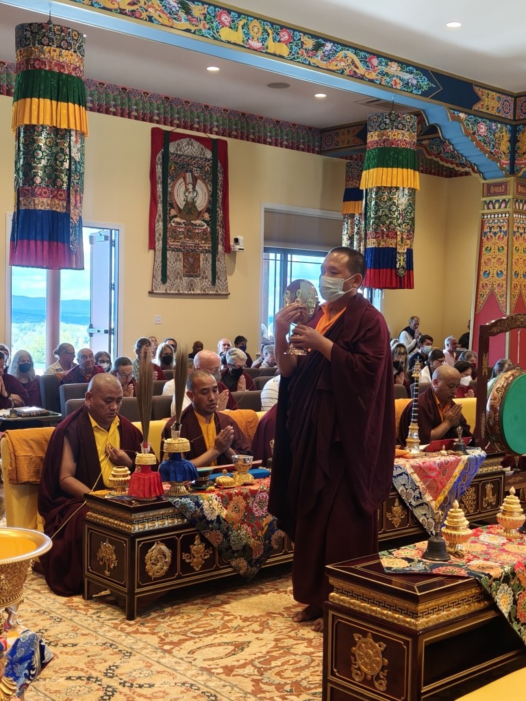 This most extensive rabne ritual, accomplished according to the tradition of Terdag Lingpa, comprised three days of intensive practice, beginning on the auspicious 8th lunar day of the 7th lunar month. Hundreds of sangha members joined in the ceremonies including over a hundred members of the local Virginia Tibetan community. The final day of the rabne fell on the auspicious Guru Rinpoche Day (the 10th lunar day), and to the great good fortune of the gathered assembly, His Eminence Dzigar Kongtrul Rinpoche presided over the rabne ritual on this auspicious.