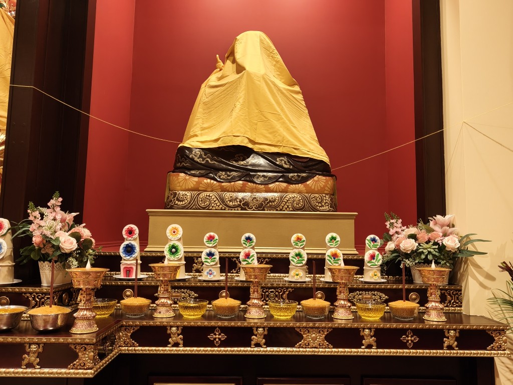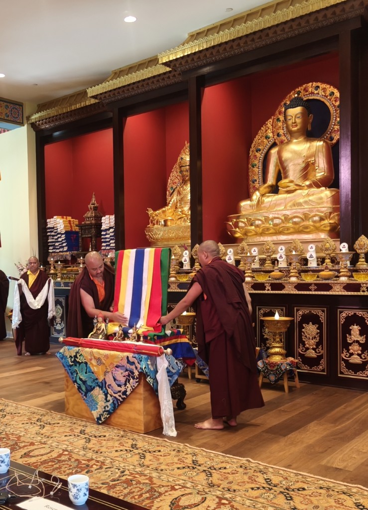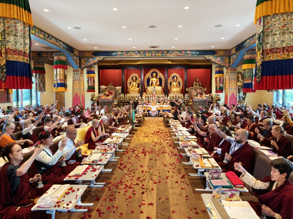 In the summer of 2025 at Mindrolling Lotus Garden, the long-awaited consecration of the newly built temple, Mindrol Gatsal, took place. Mindrolling Lotus Garden sangha members gathered from around the world to take part in this wonderful occasion. The process began with the elaborate po chog, the ritual for transferring the sacred contents, blessings, and siddhis from the old shrine room to the new temple. The po chog was held on the 16th of August, 2025. The ritual centers around the melong, or mirror, that serves as the physical support to gather the jnanasattvas and their blessings that the old shrine room has been imbued with over years of practice, studies, teachings, and transmissions. The melong is then covered in cloth in the colors of the Five Buddha Families and brought in a ceremonial procession from the old temple into the new temple.