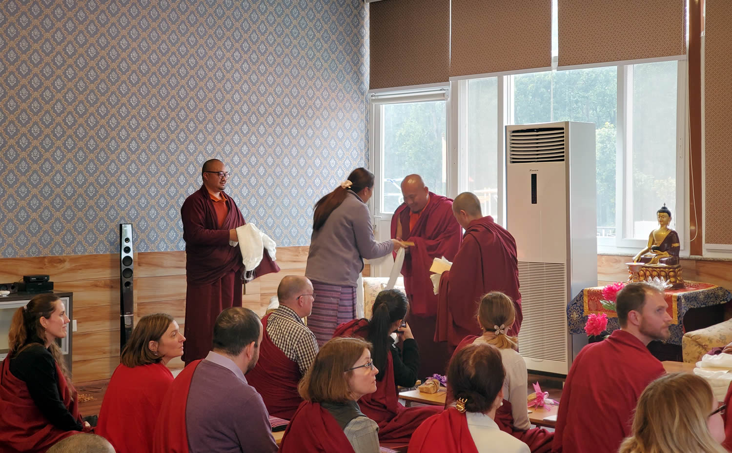 The group then proceeded to the upper hall classroom, where Rinpoche described her vision for the Mindrol Lekshey program, and introduced each of the teachers of the program. After students offered mandala and khatags to each of the teachers, they introduced themselves to their teachers, telling them who they were, where they were from and a bit about their study and practice background. Selected students then made presentations on their intent and aspirations for the program, highlighting the historic nature of this endeavor, their gratitude for being included, and their hopes for the transmission of the dharma in the west, to the assembly. At the close of the ceremony, Rinpoche, Jetsunla and the nuns presented each of the participants all items necessary for their study and practice, such as the collection of all texts and instructions books, practice shawls and clothing, and many gift items such as hot water bottles, electric blankets, kettles and dishes and other basic amenities. The day ended joyously with a celebratory dinner.