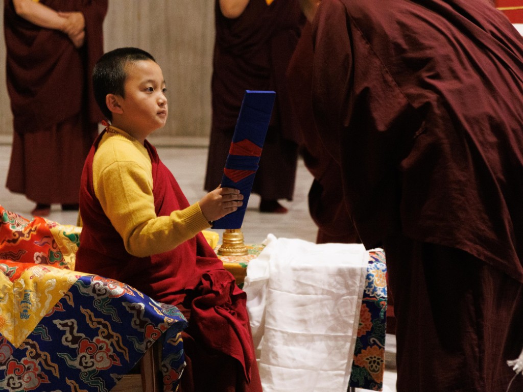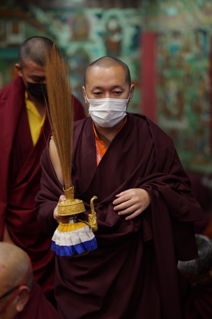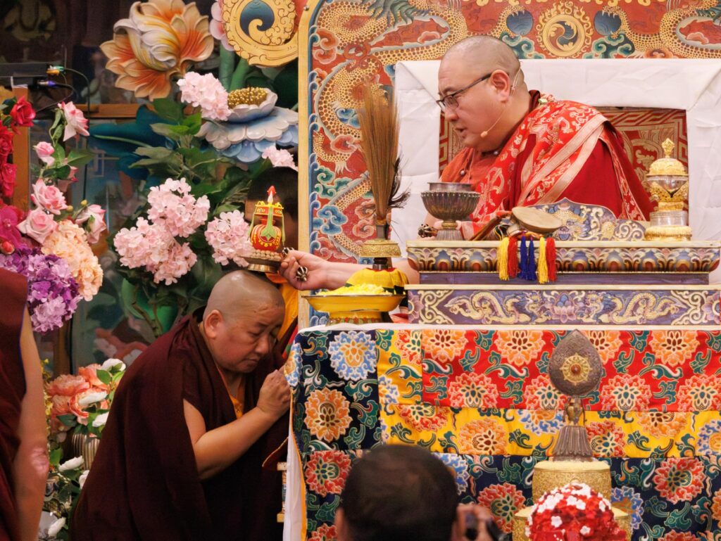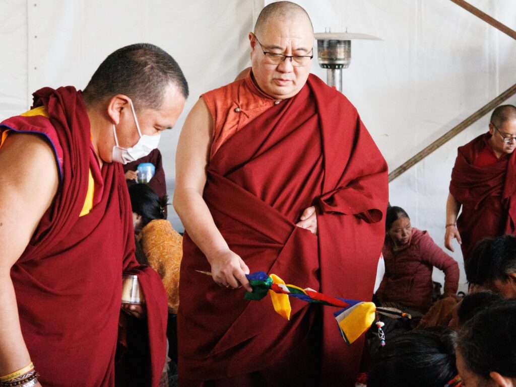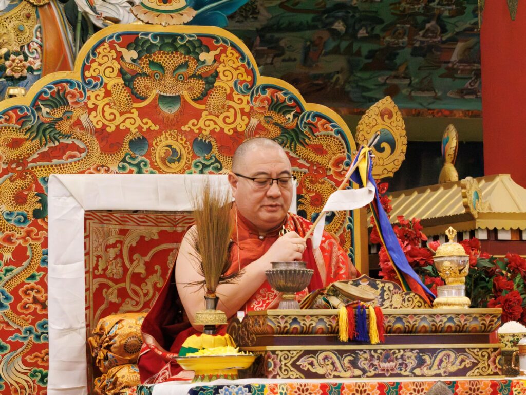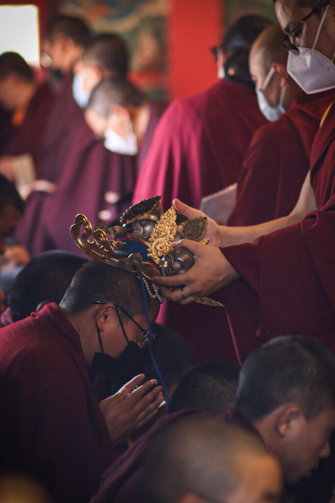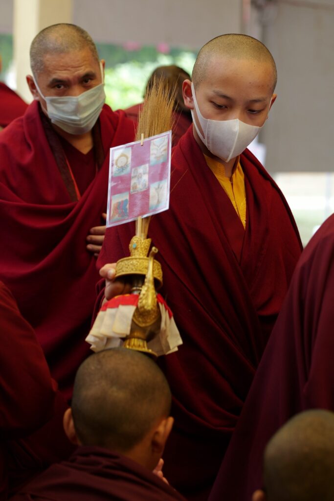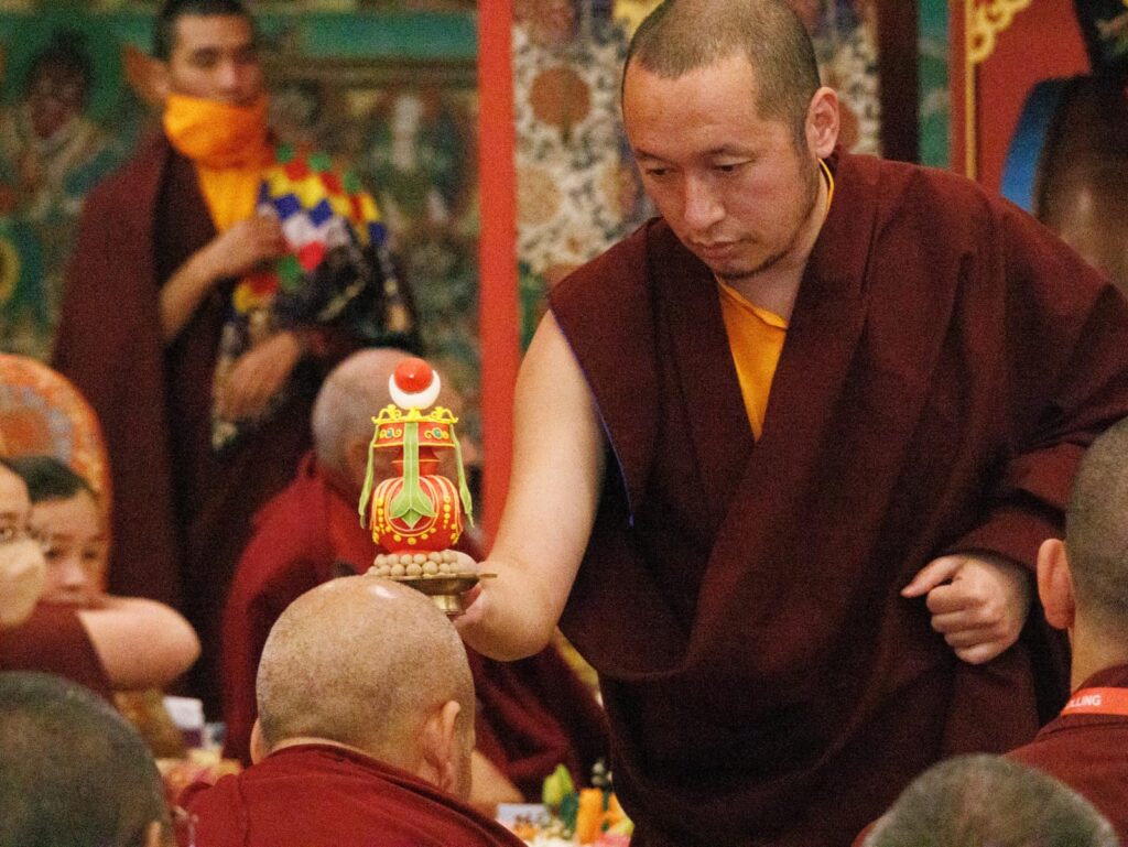 During these afternoon sessions, the young generation of teachers, yangsis, and tulkus performed the wangdrim, bestowing the empowerment articles to each person in the assembled sangha.