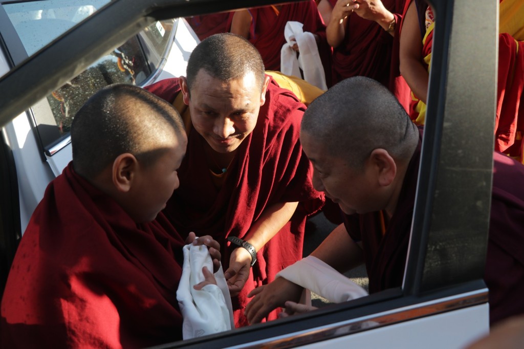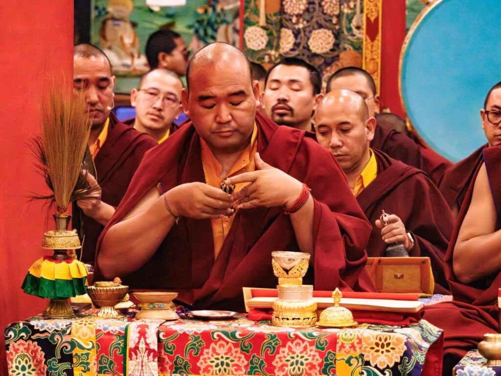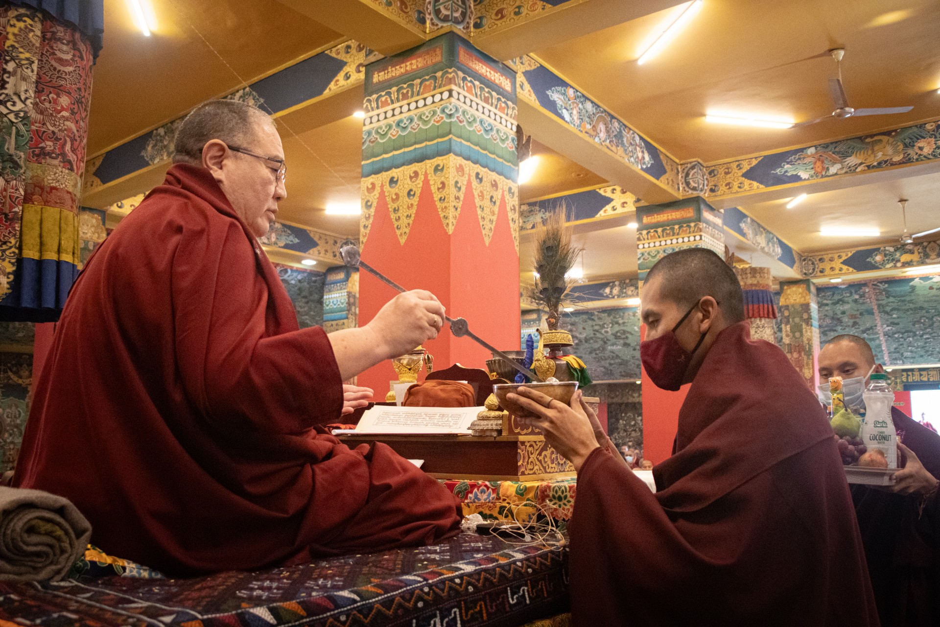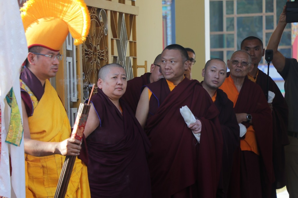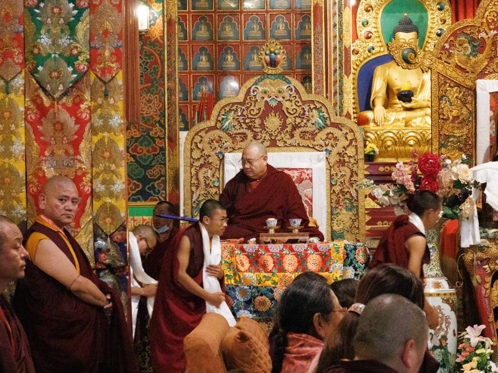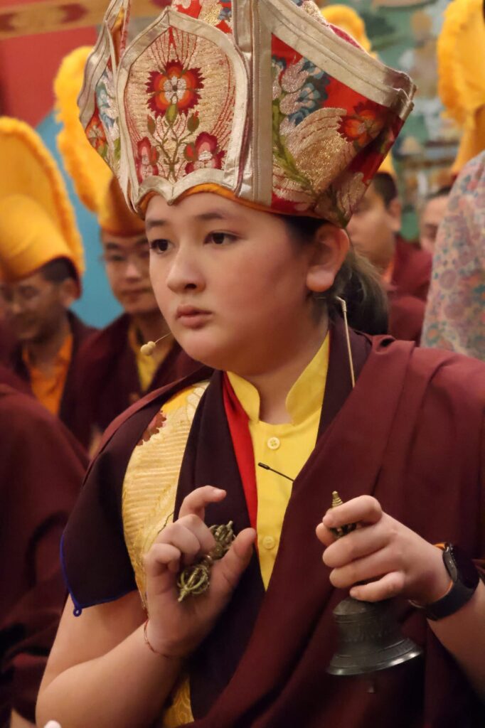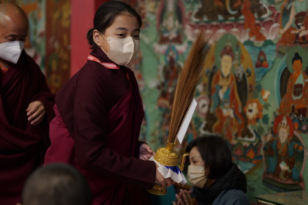 During these afternoon sessions, the young generation of teachers, yangsis, and tulkus performed the wangdrim, bestowing the empowerment articles to each person in the assembled sangha.