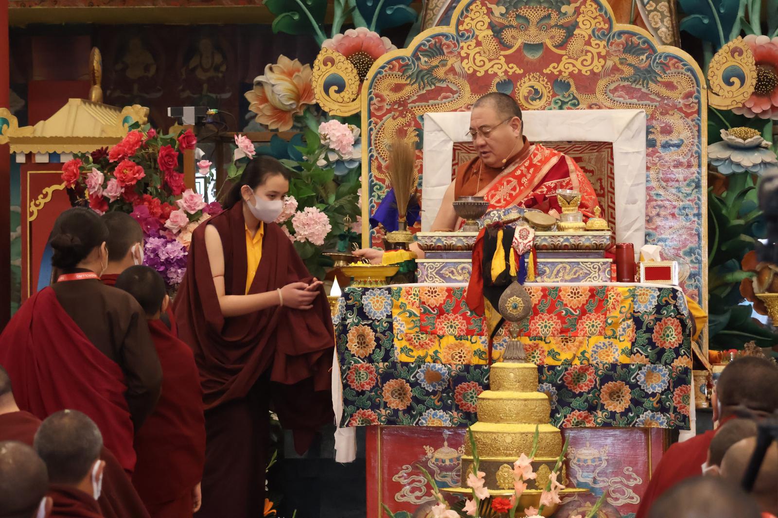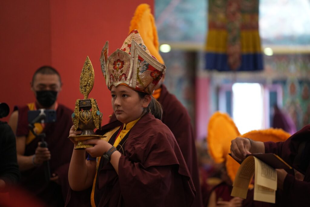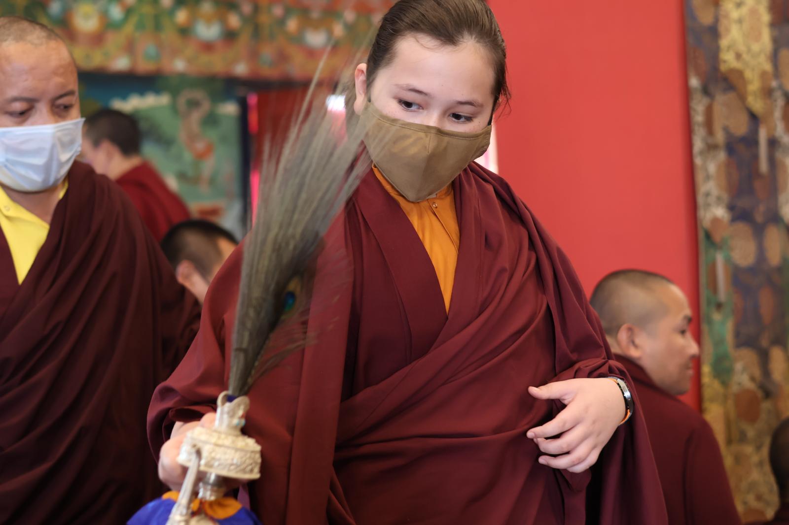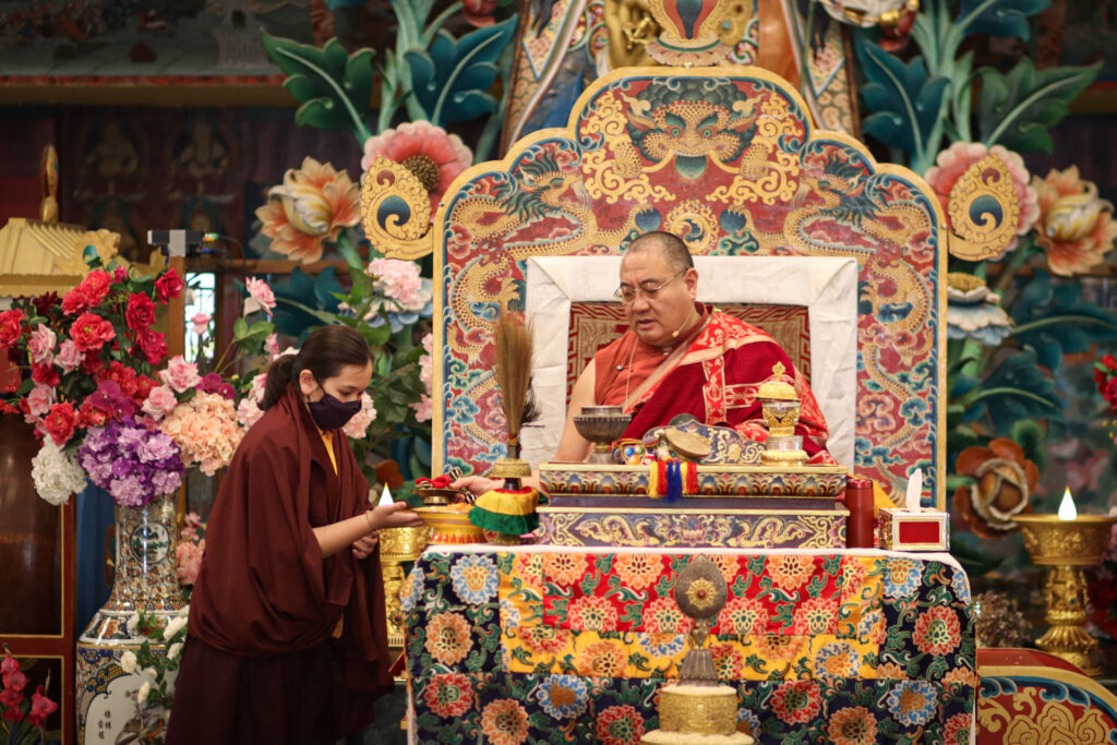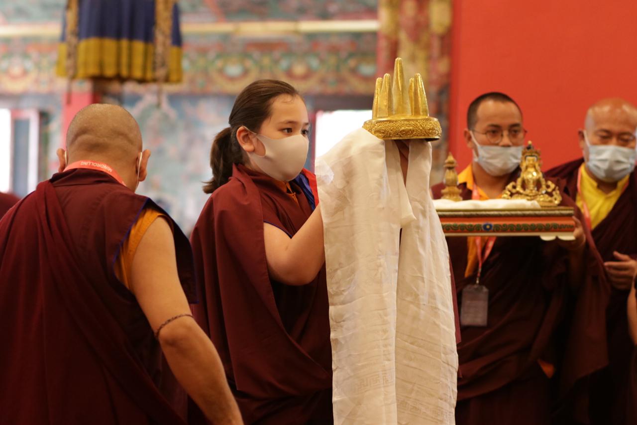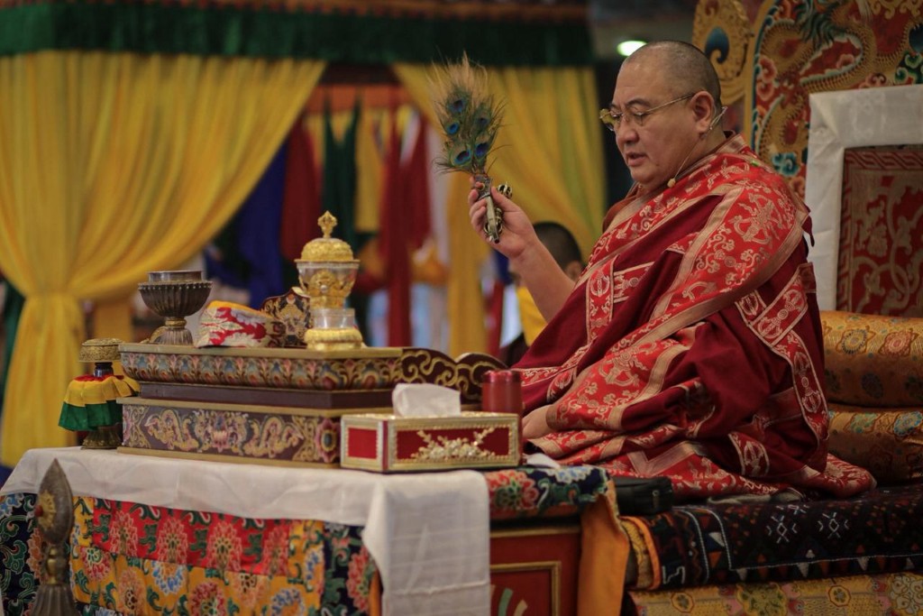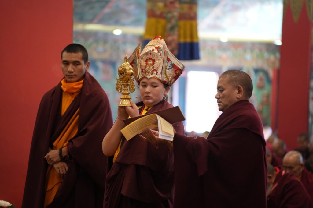 During these afternoon sessions, the young generation of teachers, yangsis, and tulkus performed the wangdrim, bestowing the empowerment articles to each person in the assembled sangha.