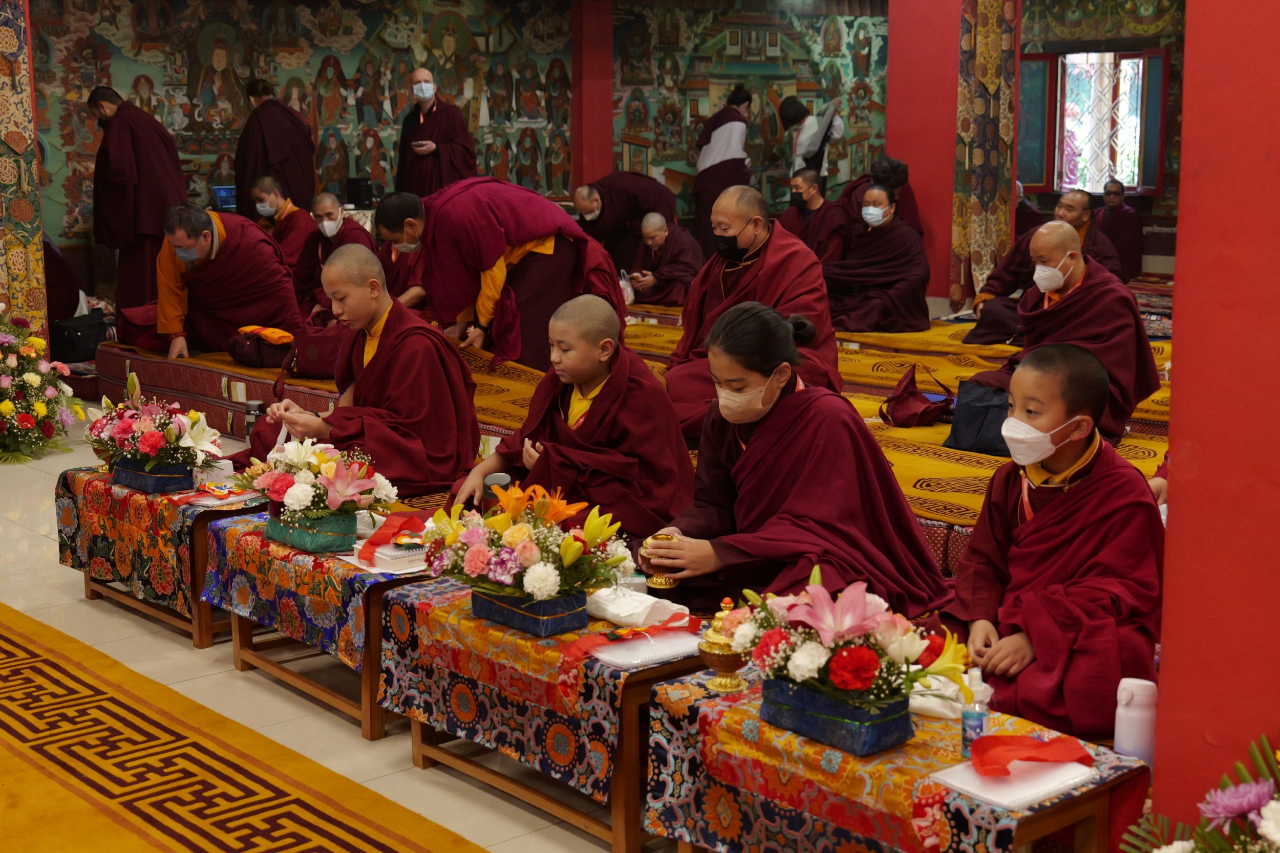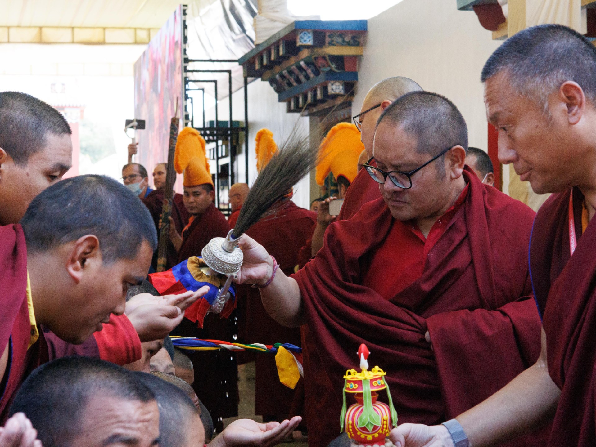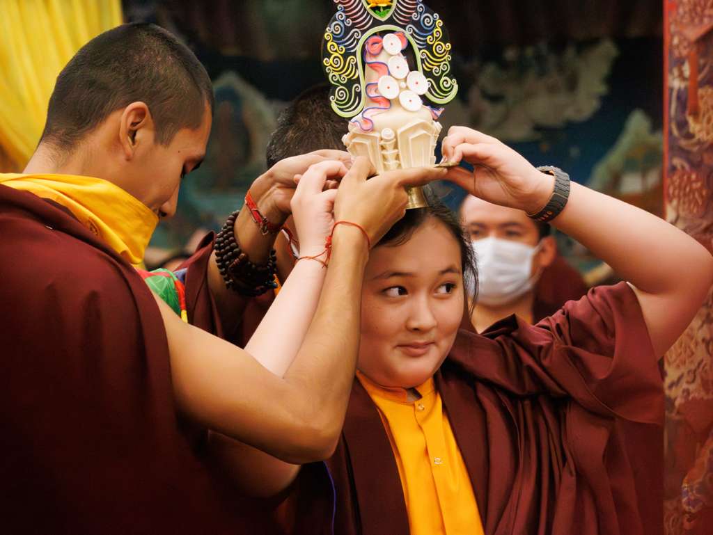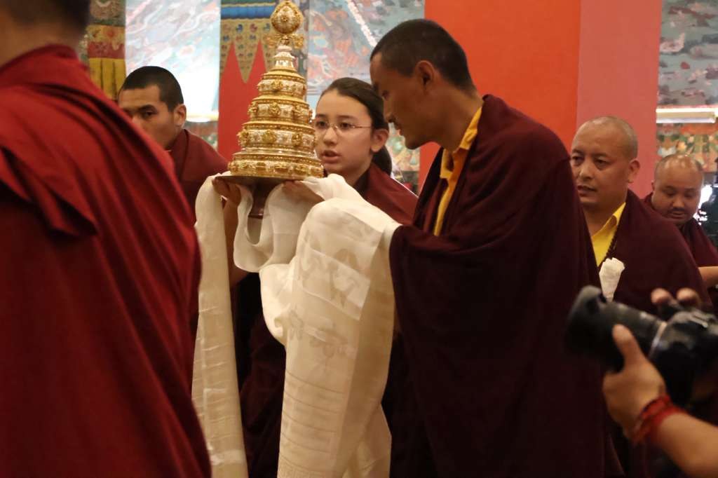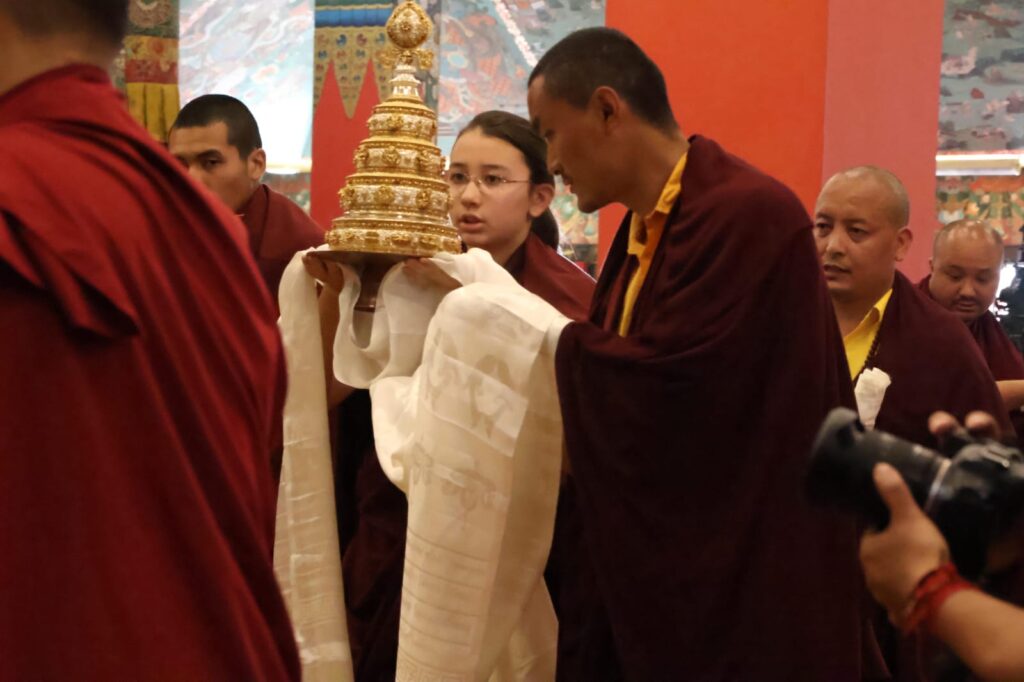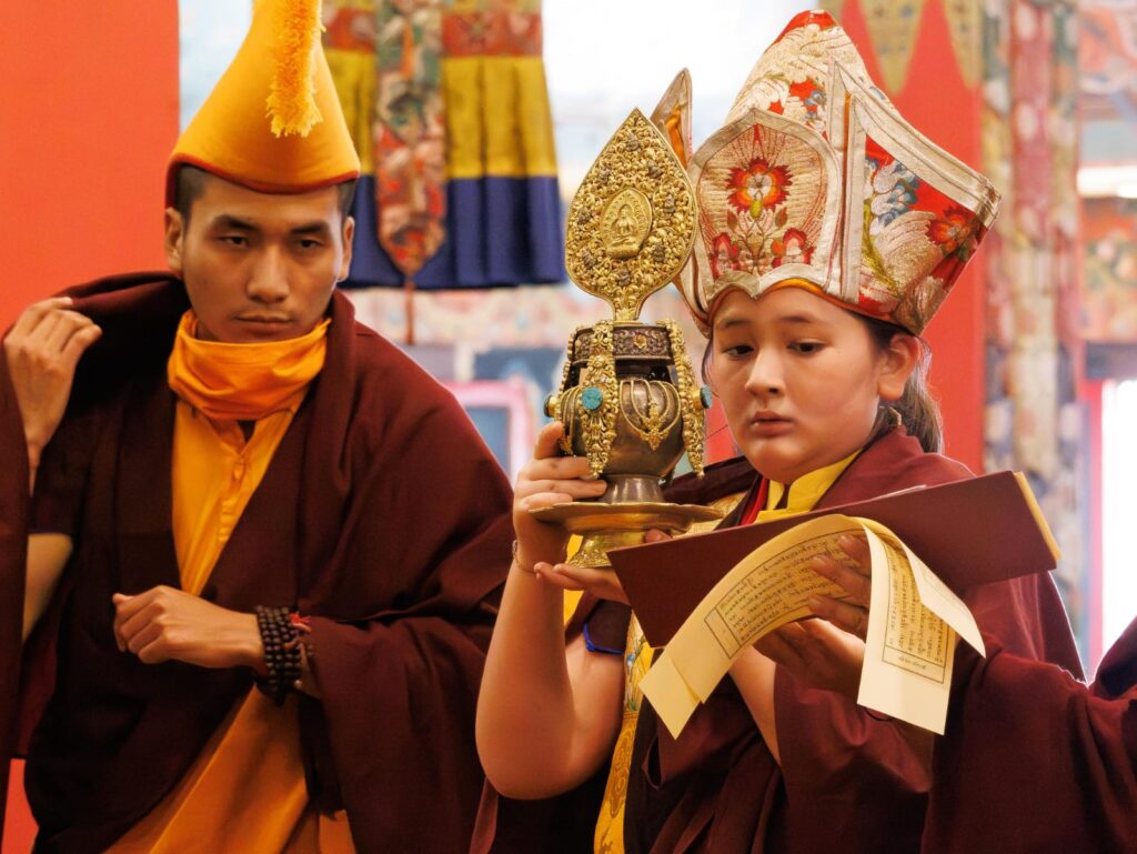During these afternoon sessions, the young generation of teachers, yangsis, and tulkus performed the wangdrim, bestowing the empowerment articles to each person in the assembled sangha.