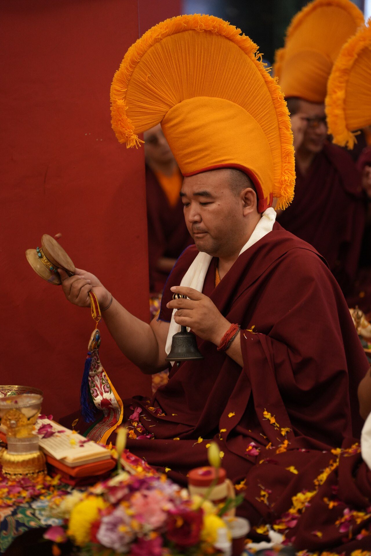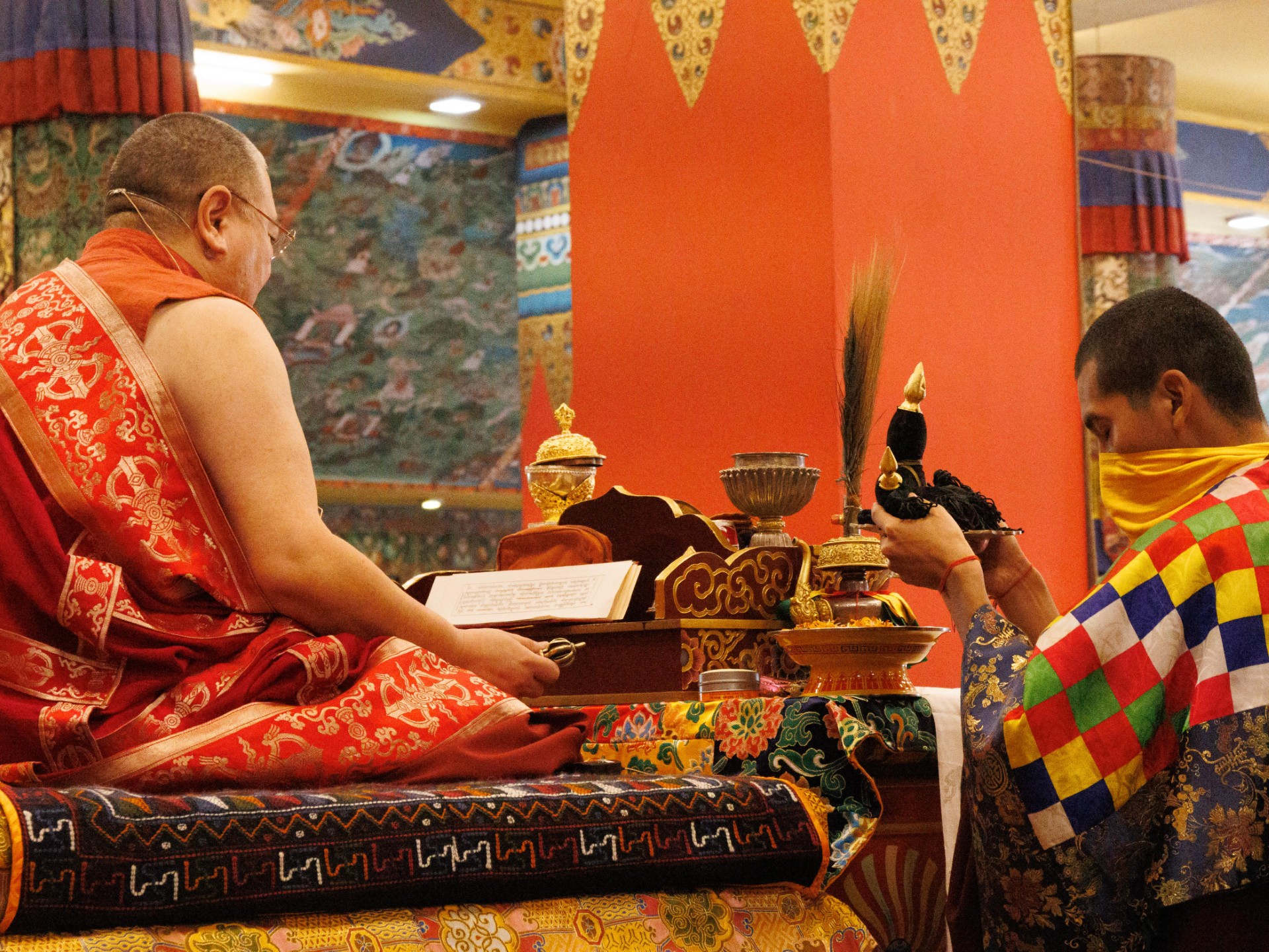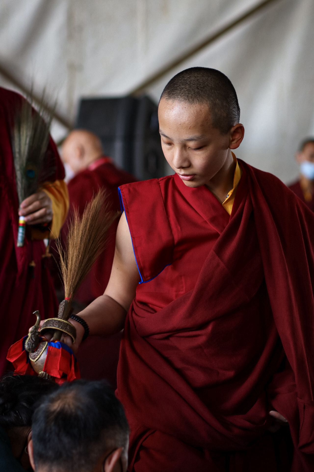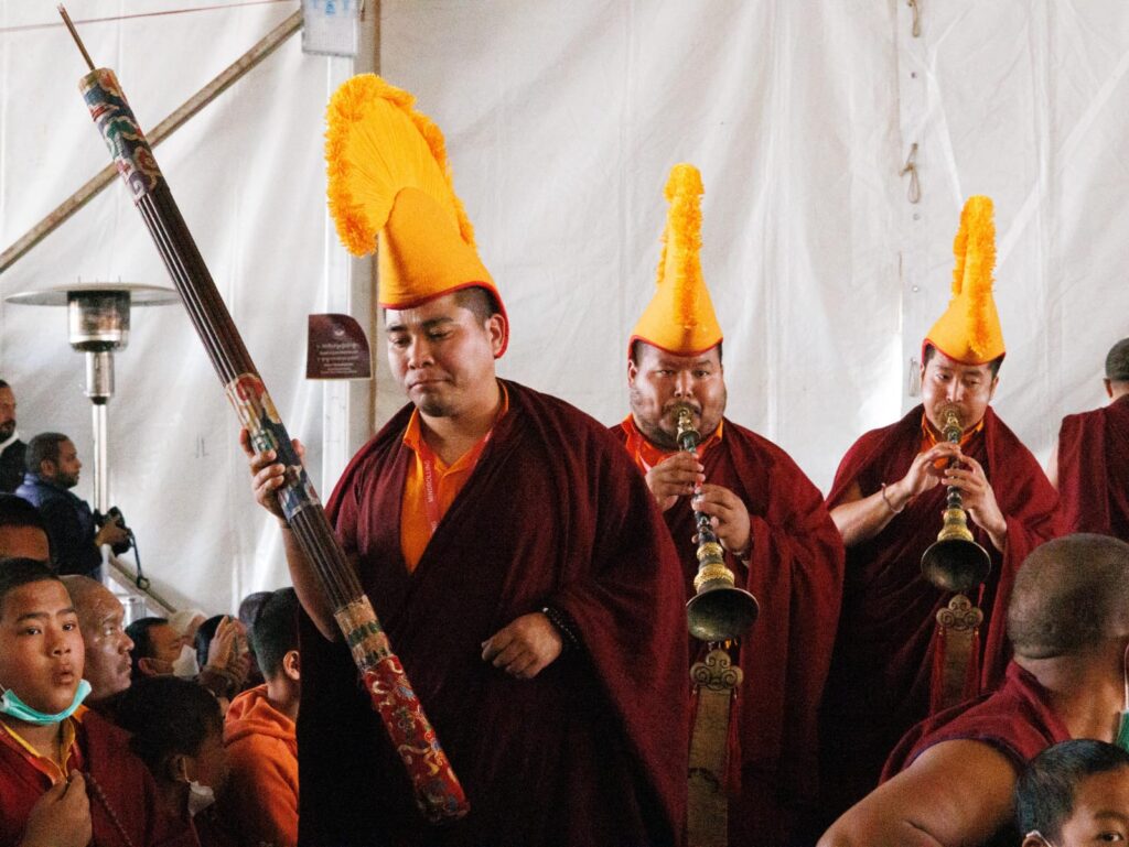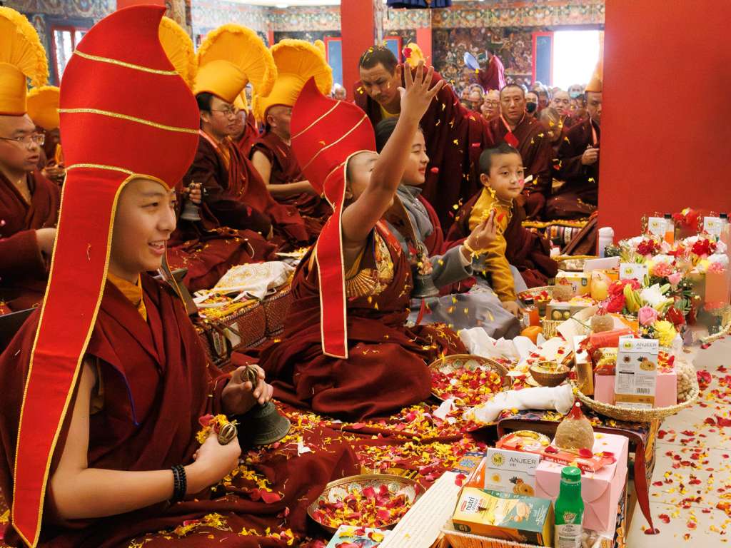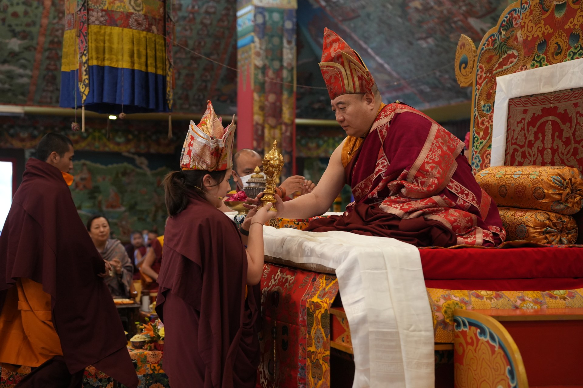 During these afternoon sessions, the young generation of teachers, yangsis, and tulkus performed the wangdrim, bestowing the empowerment articles to each person in the assembled sangha.