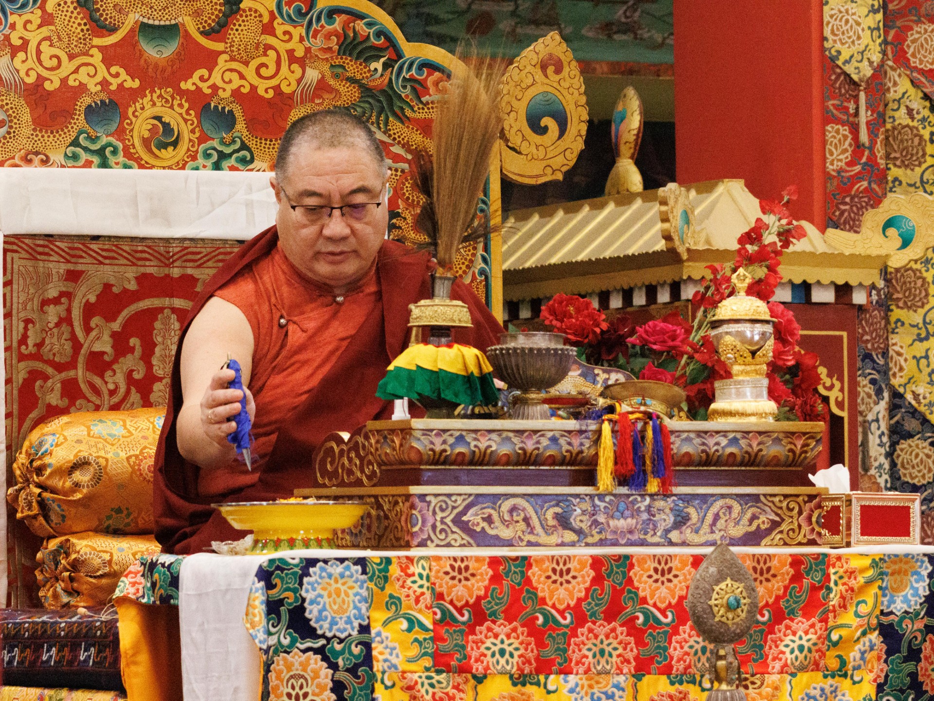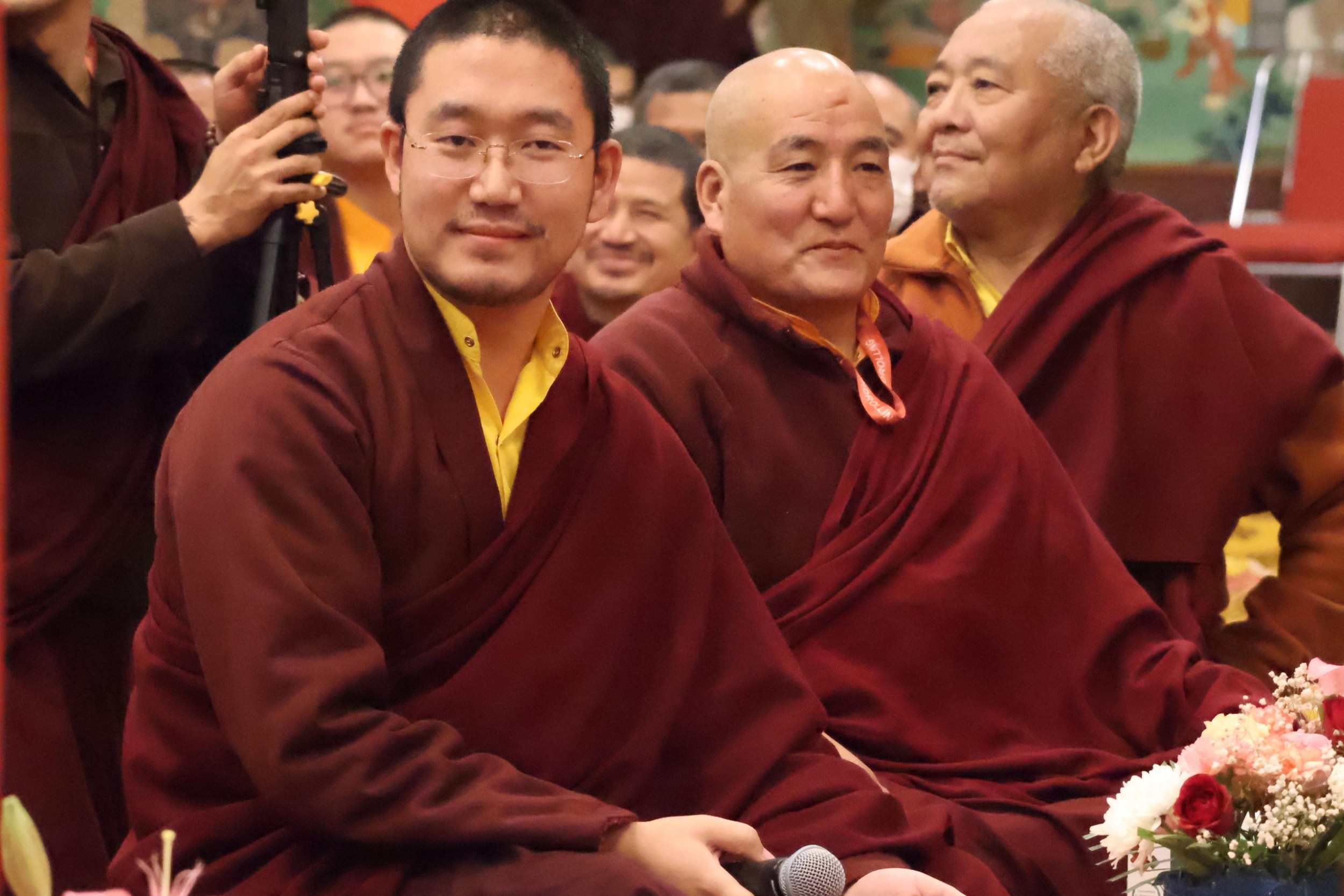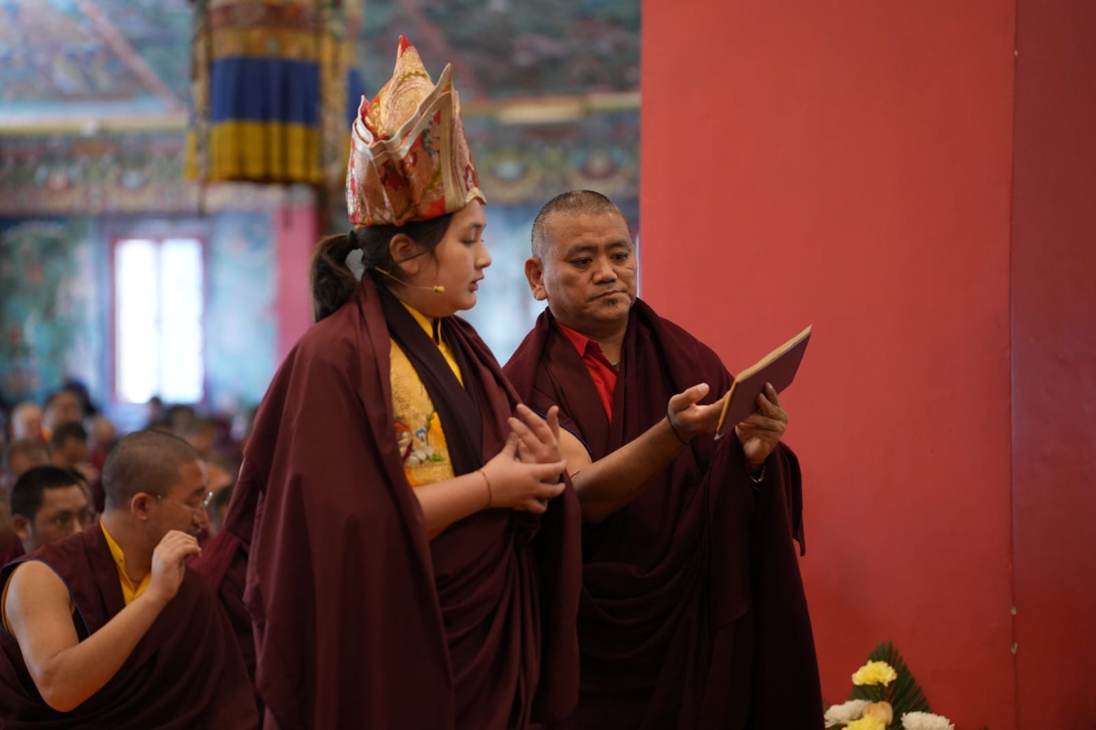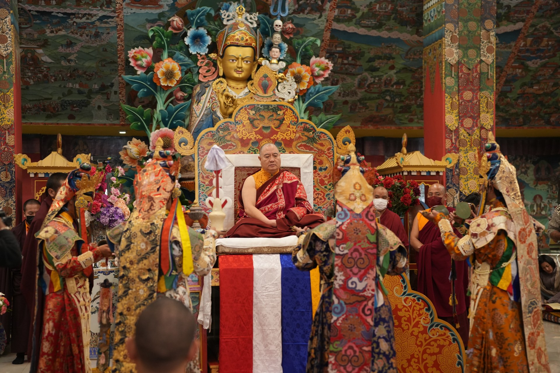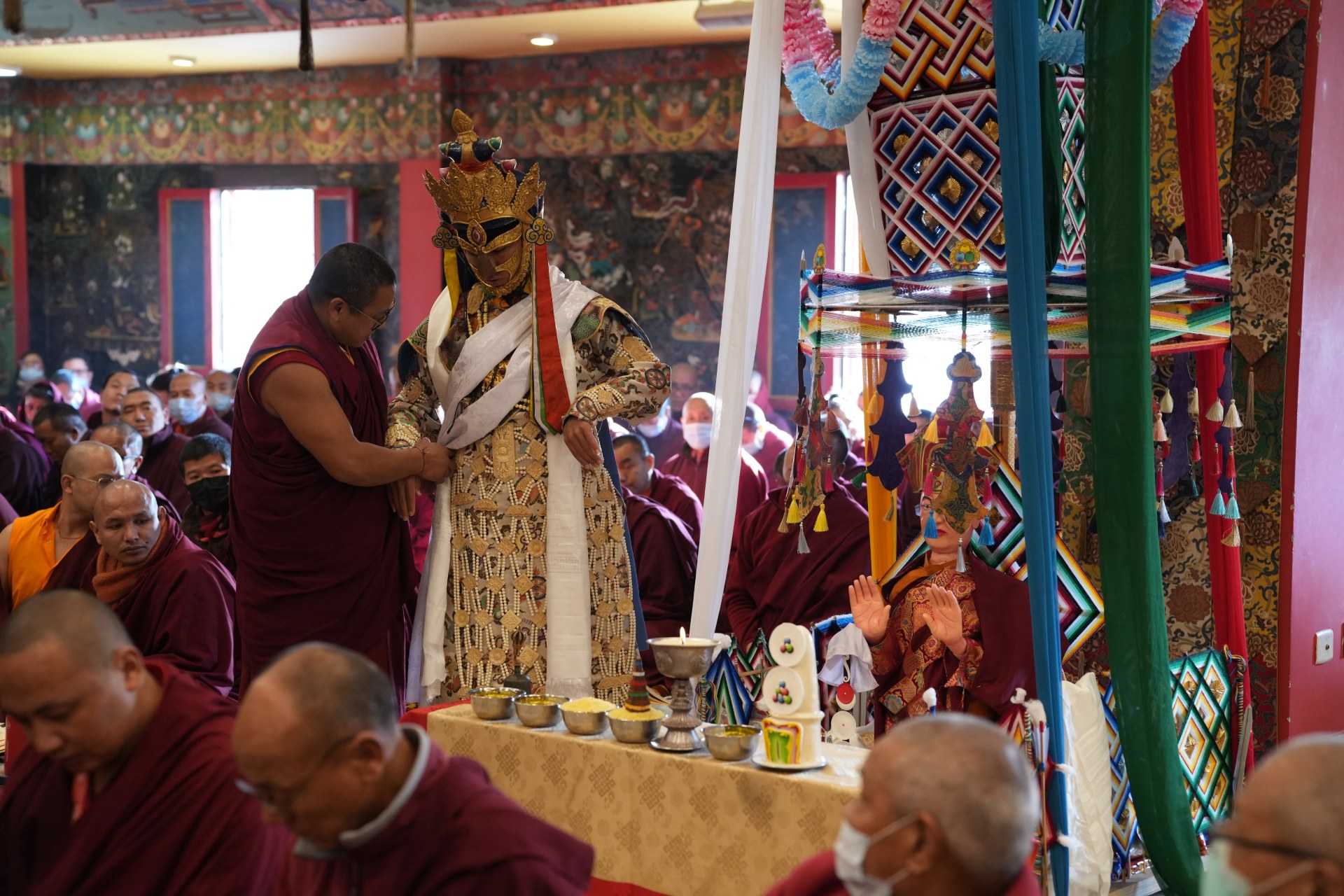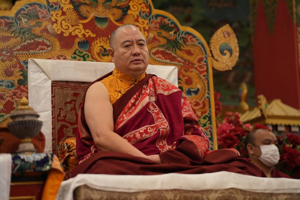 During these afternoon sessions, the young generation of teachers, yangsis, and tulkus performed the wangdrim, bestowing the empowerment articles to each person in the assembled sangha.