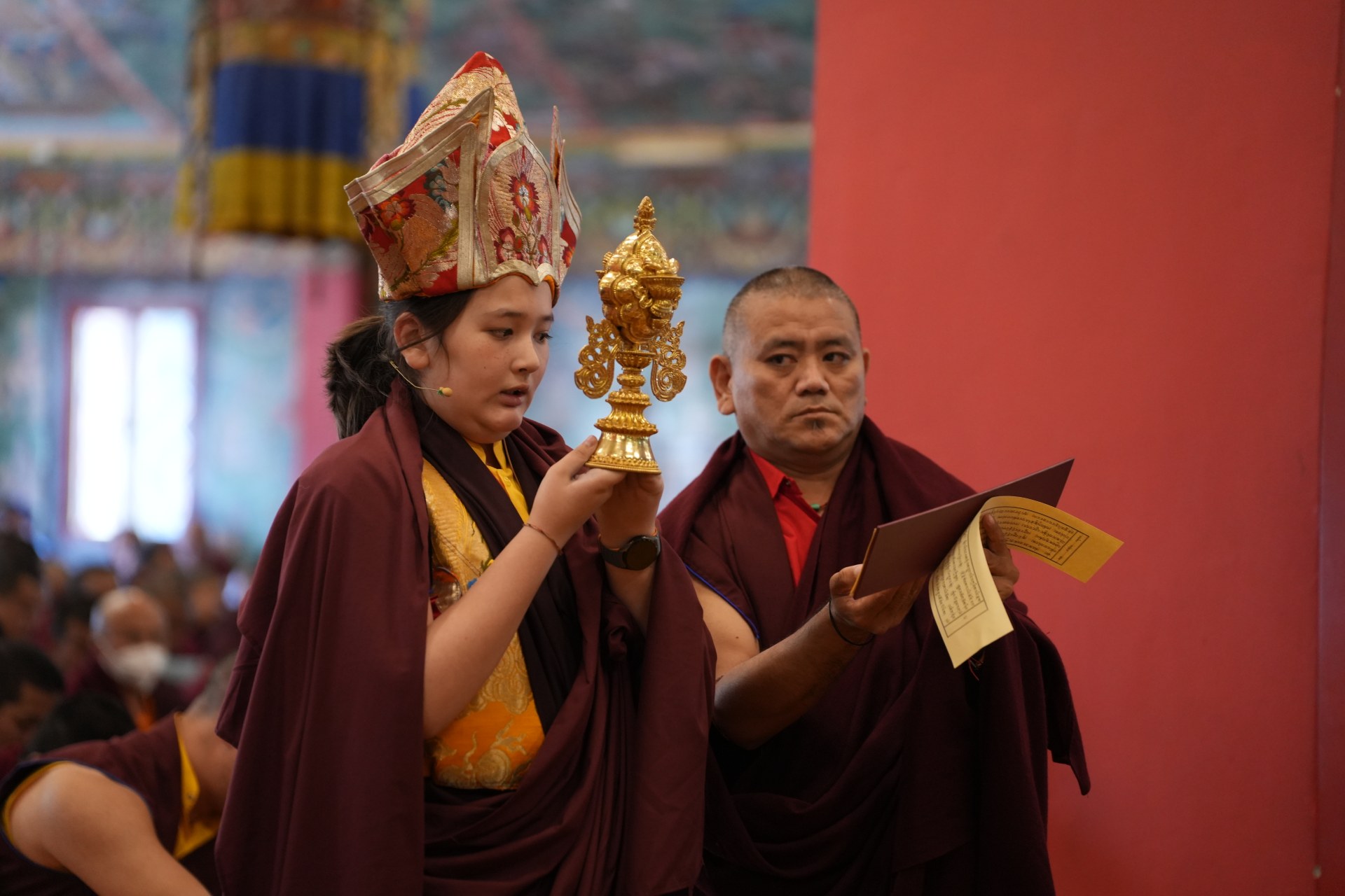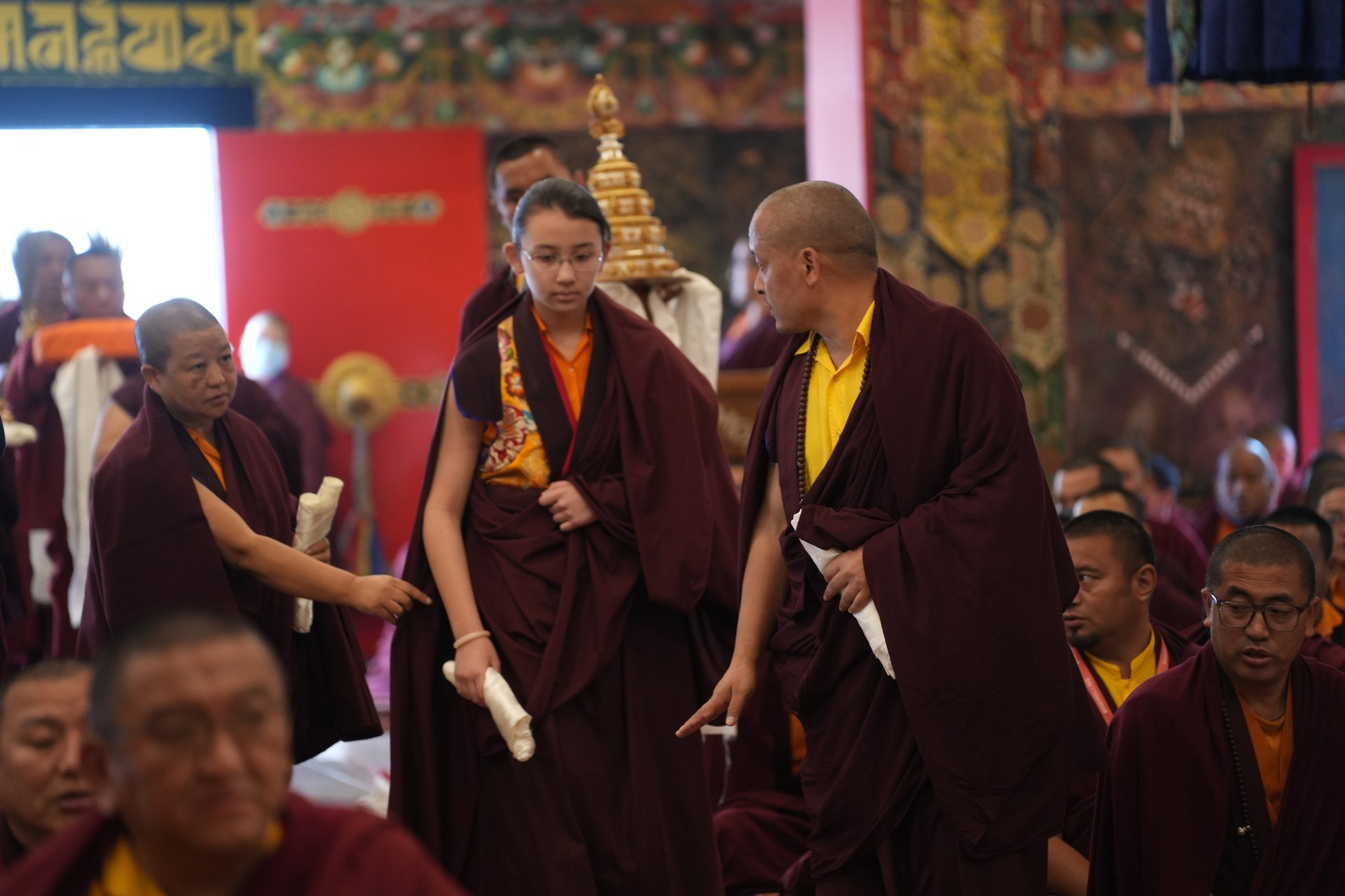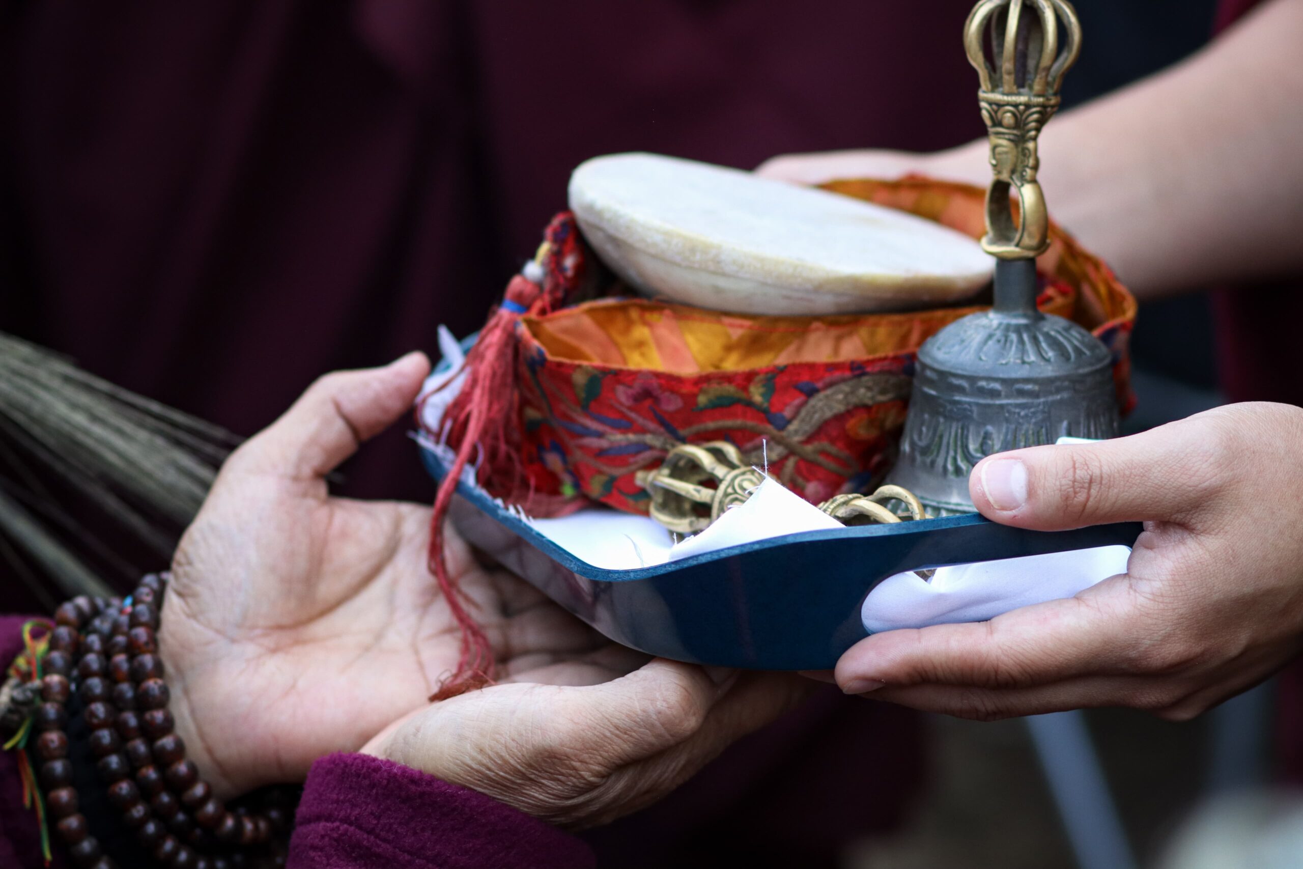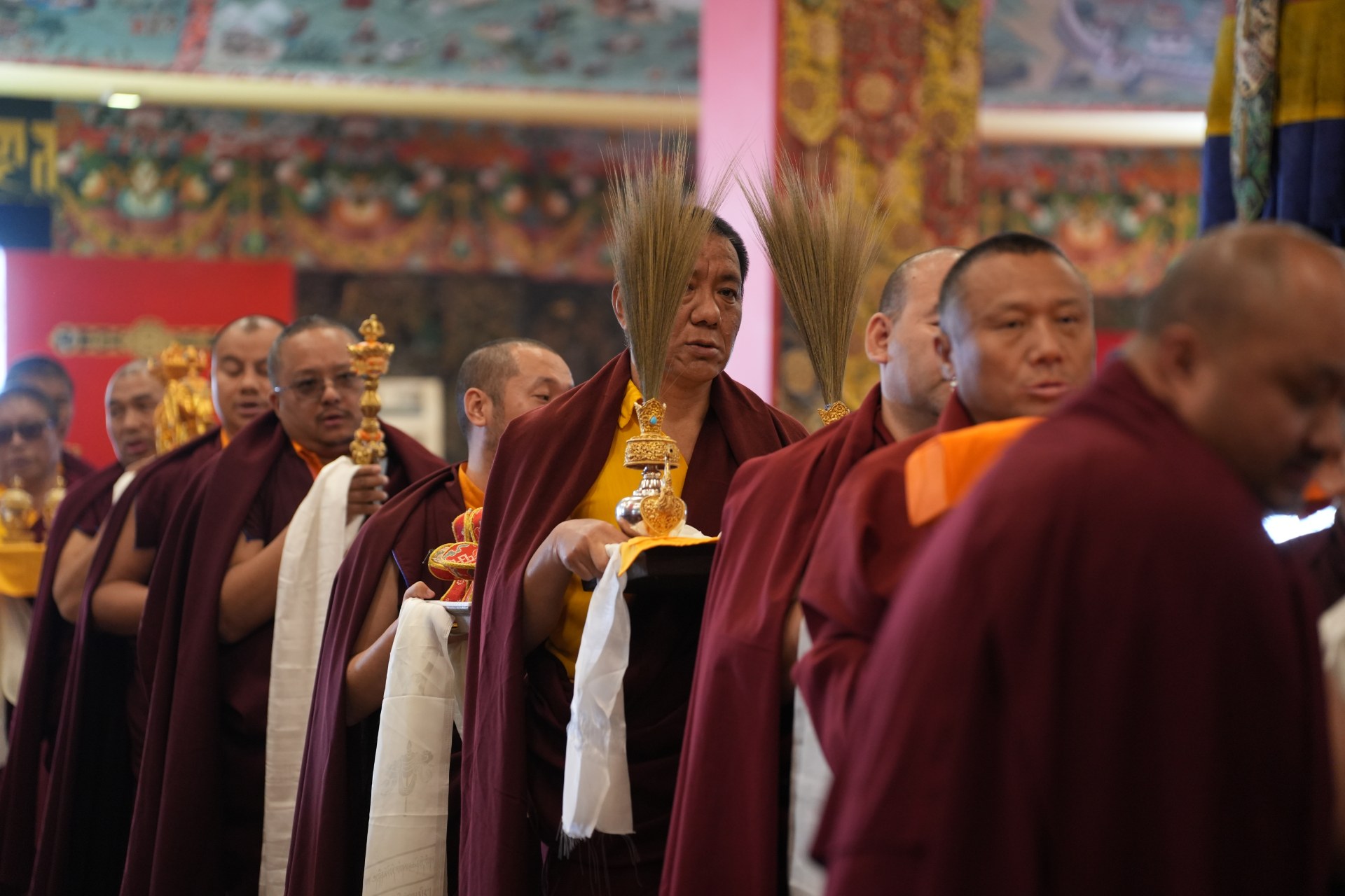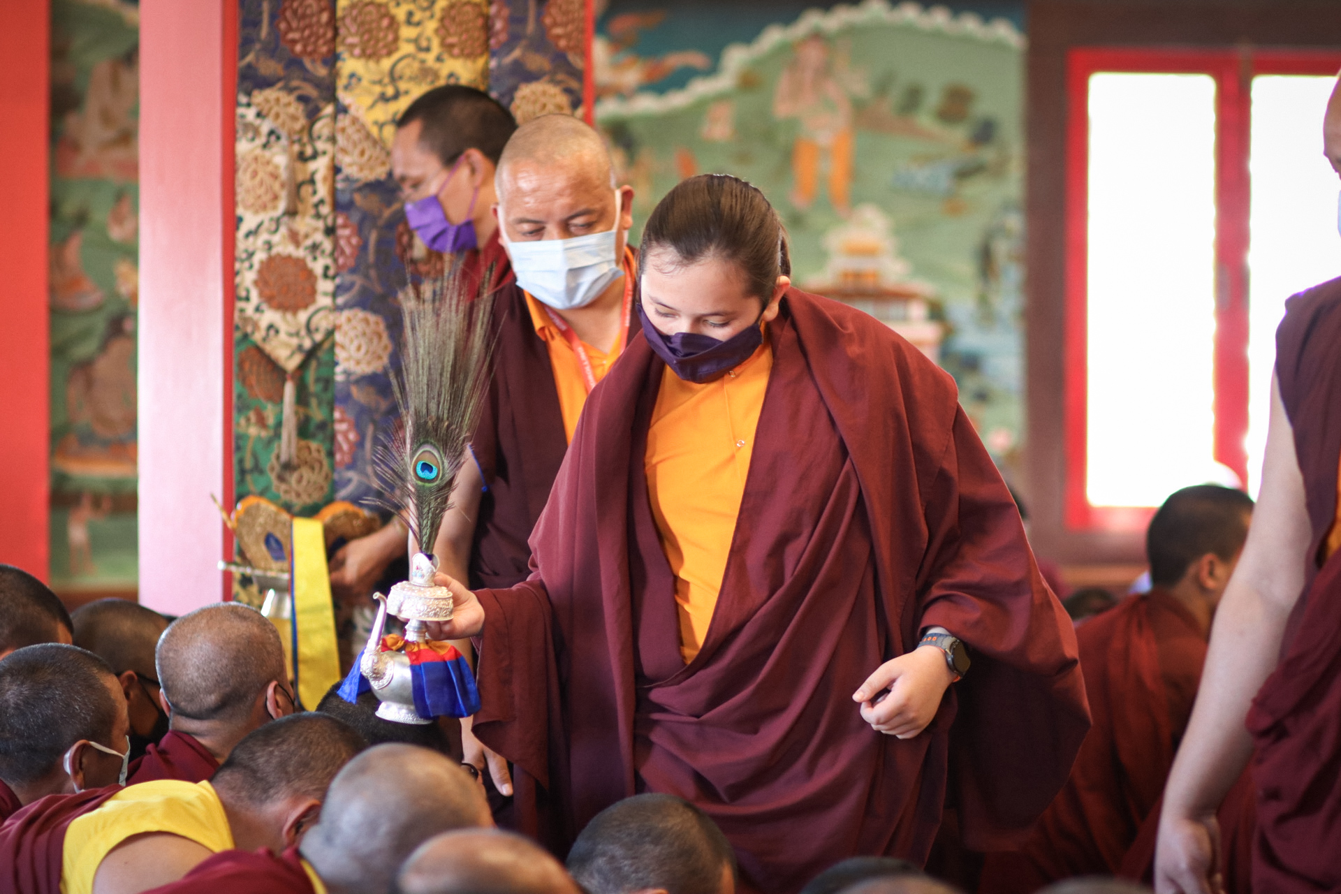 During these afternoon sessions, the young generation of teachers, yangsis, and tulkus performed the wangdrim, bestowing the empowerment articles to each person in the assembled sangha.
