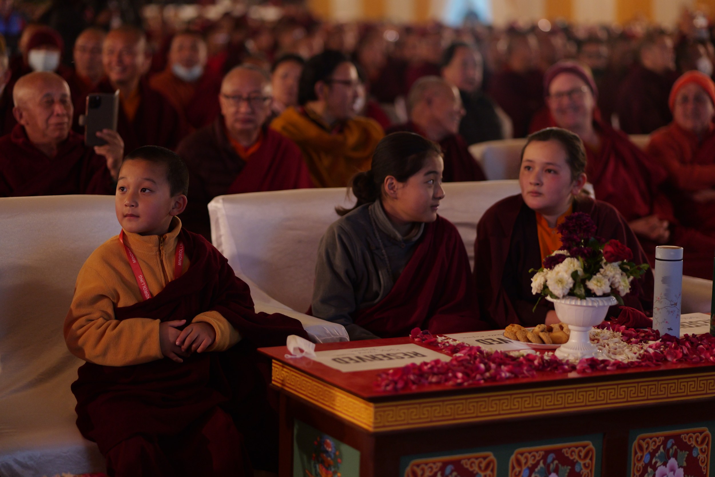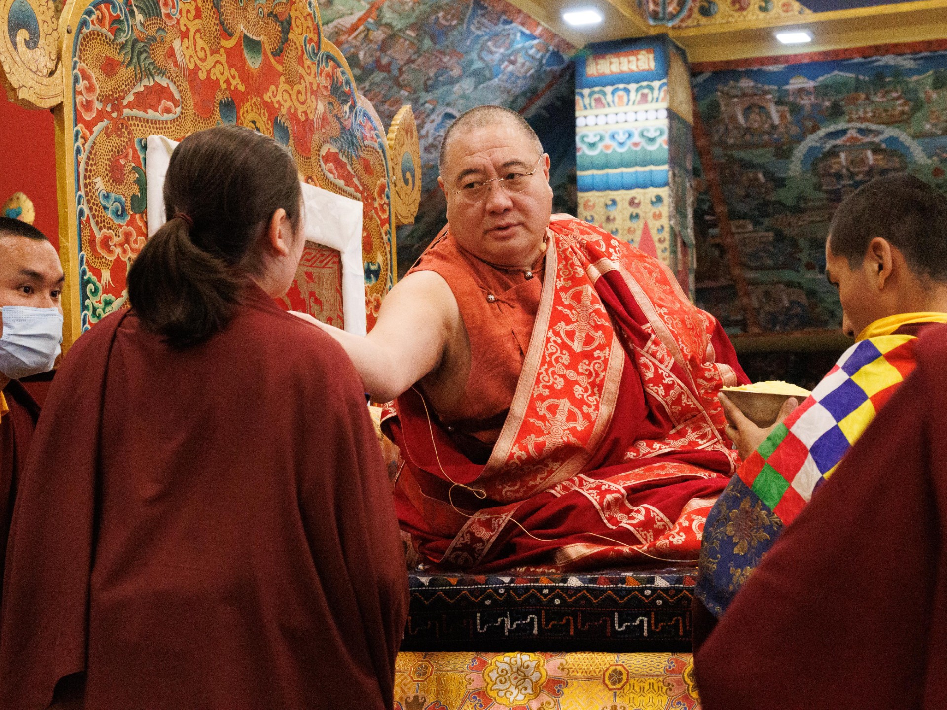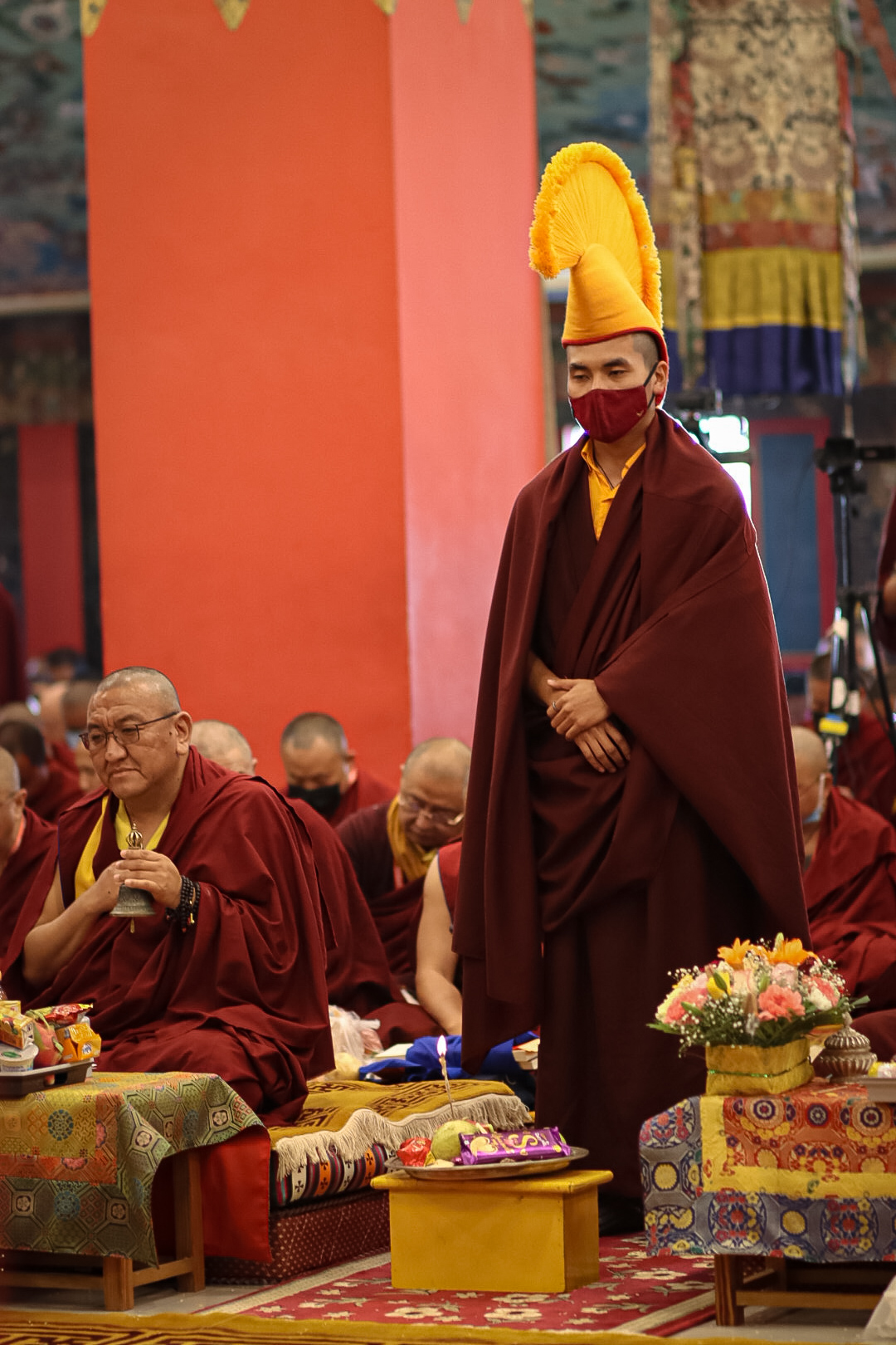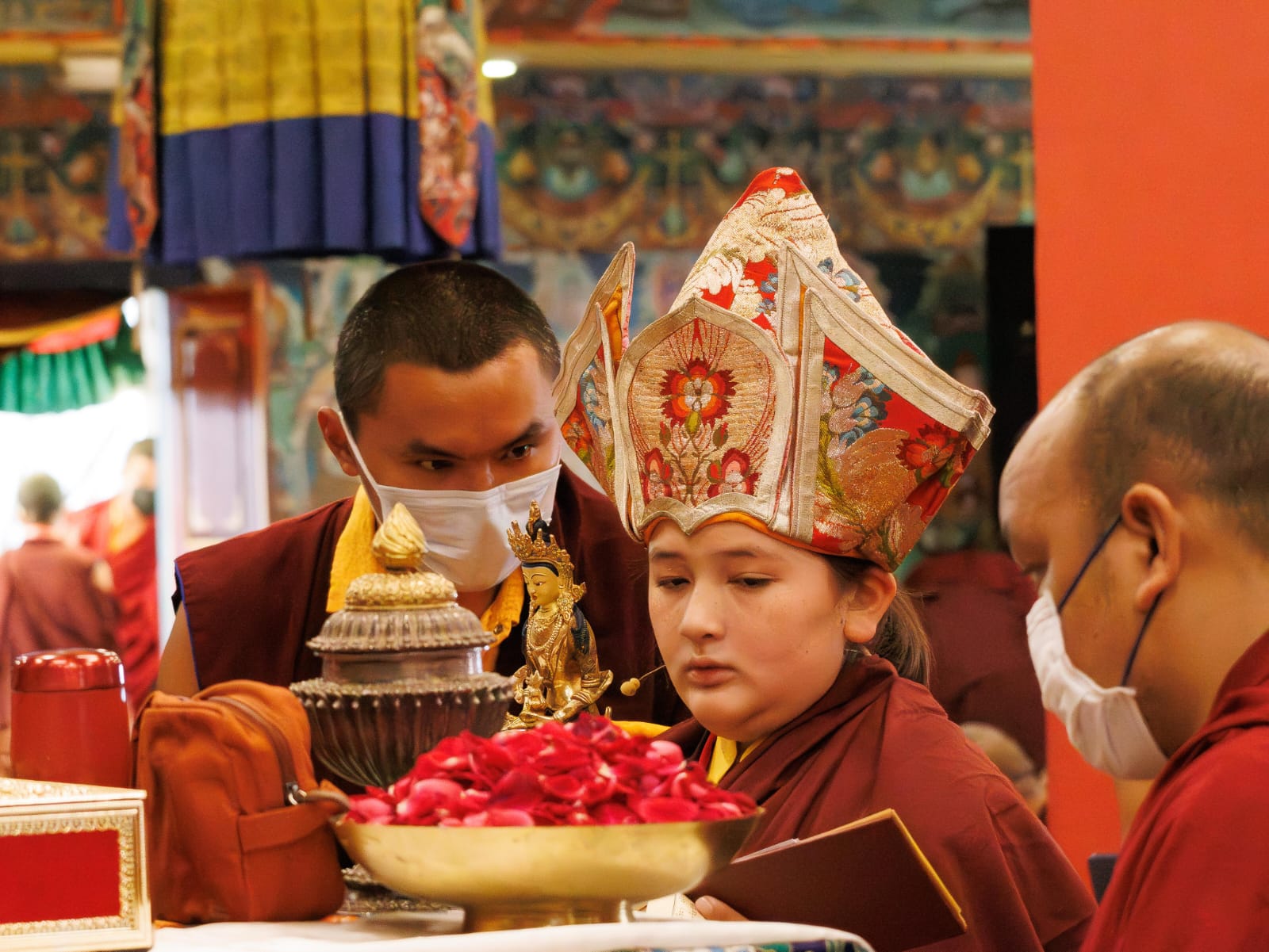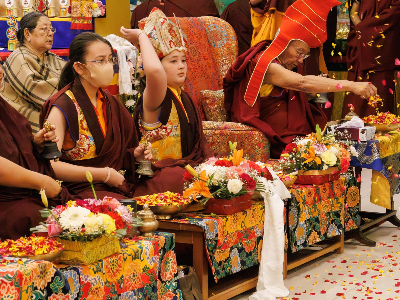 During these afternoon sessions, the young generation of teachers, yangsis, and tulkus performed the wangdrim, bestowing the empowerment articles to each person in the assembled sangha.