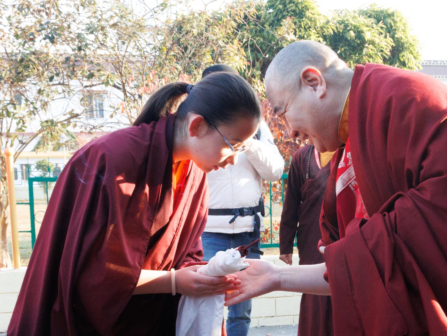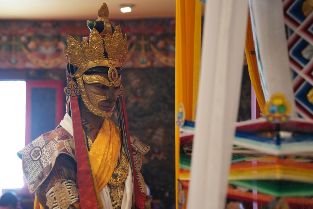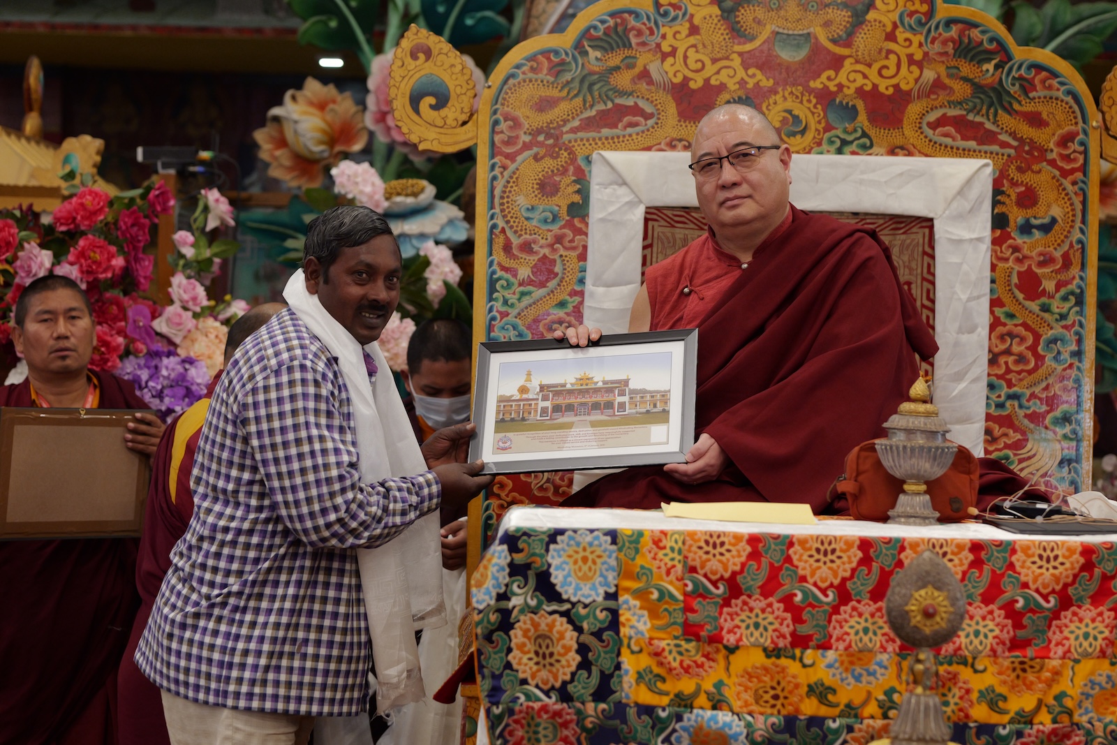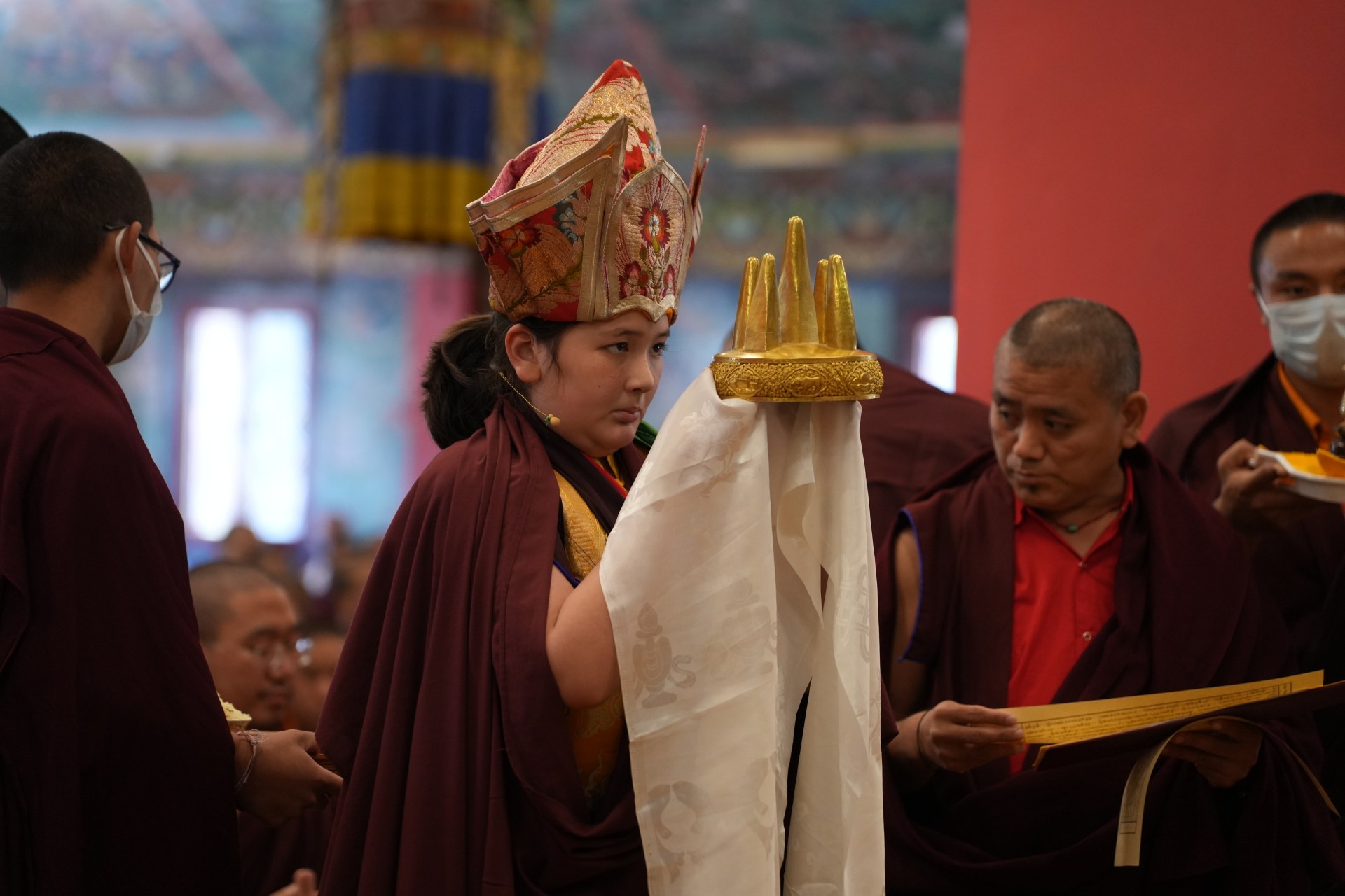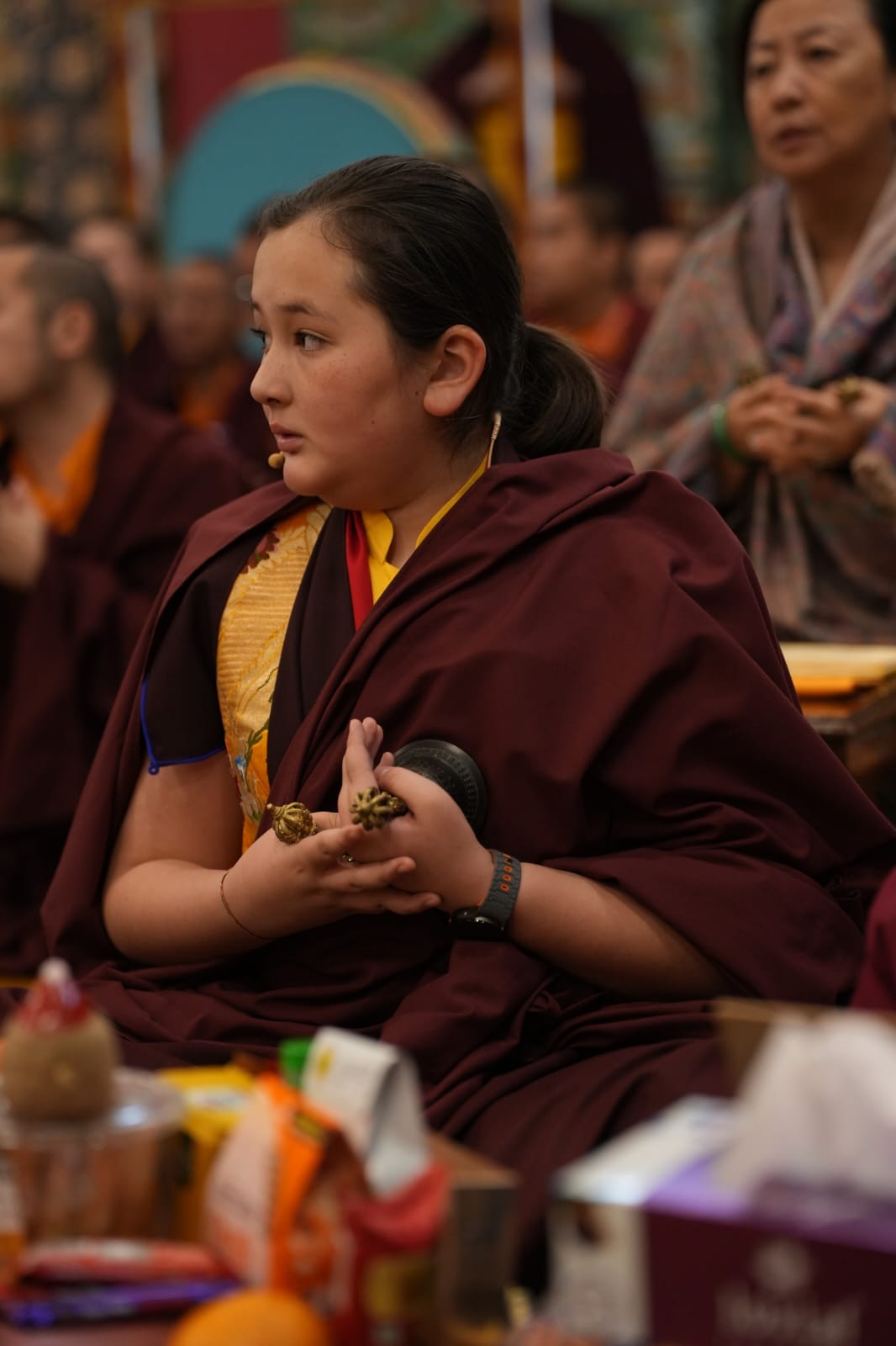 During these afternoon sessions, the young generation of teachers, yangsis, and tulkus performed the wangdrim, bestowing the empowerment articles to each person in the assembled sangha.