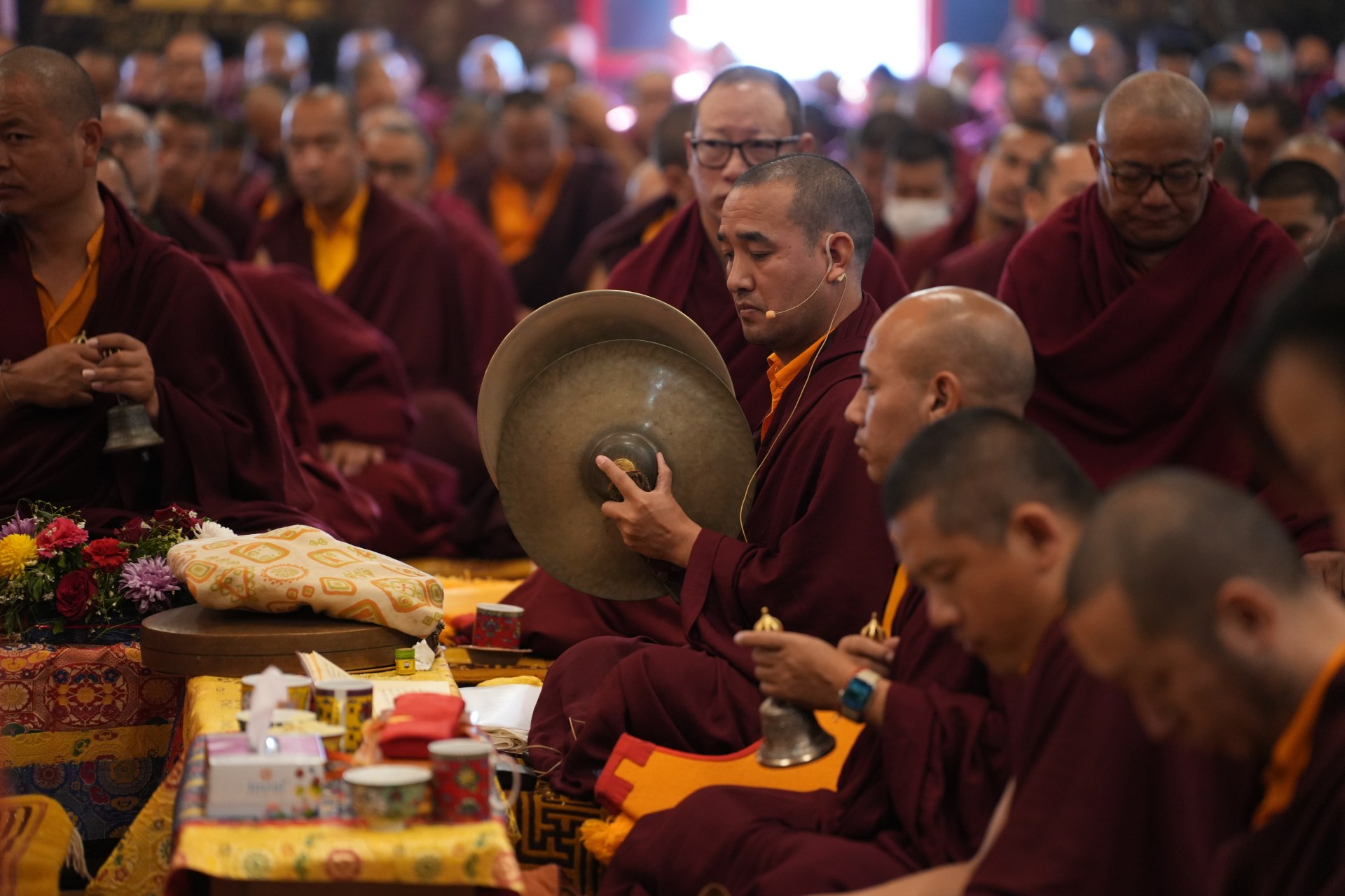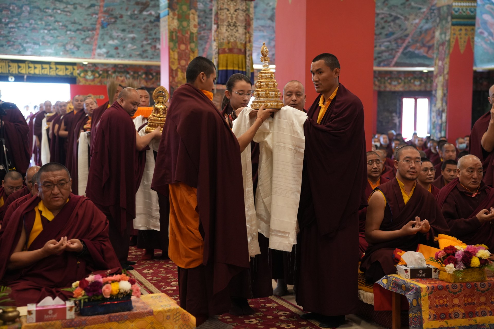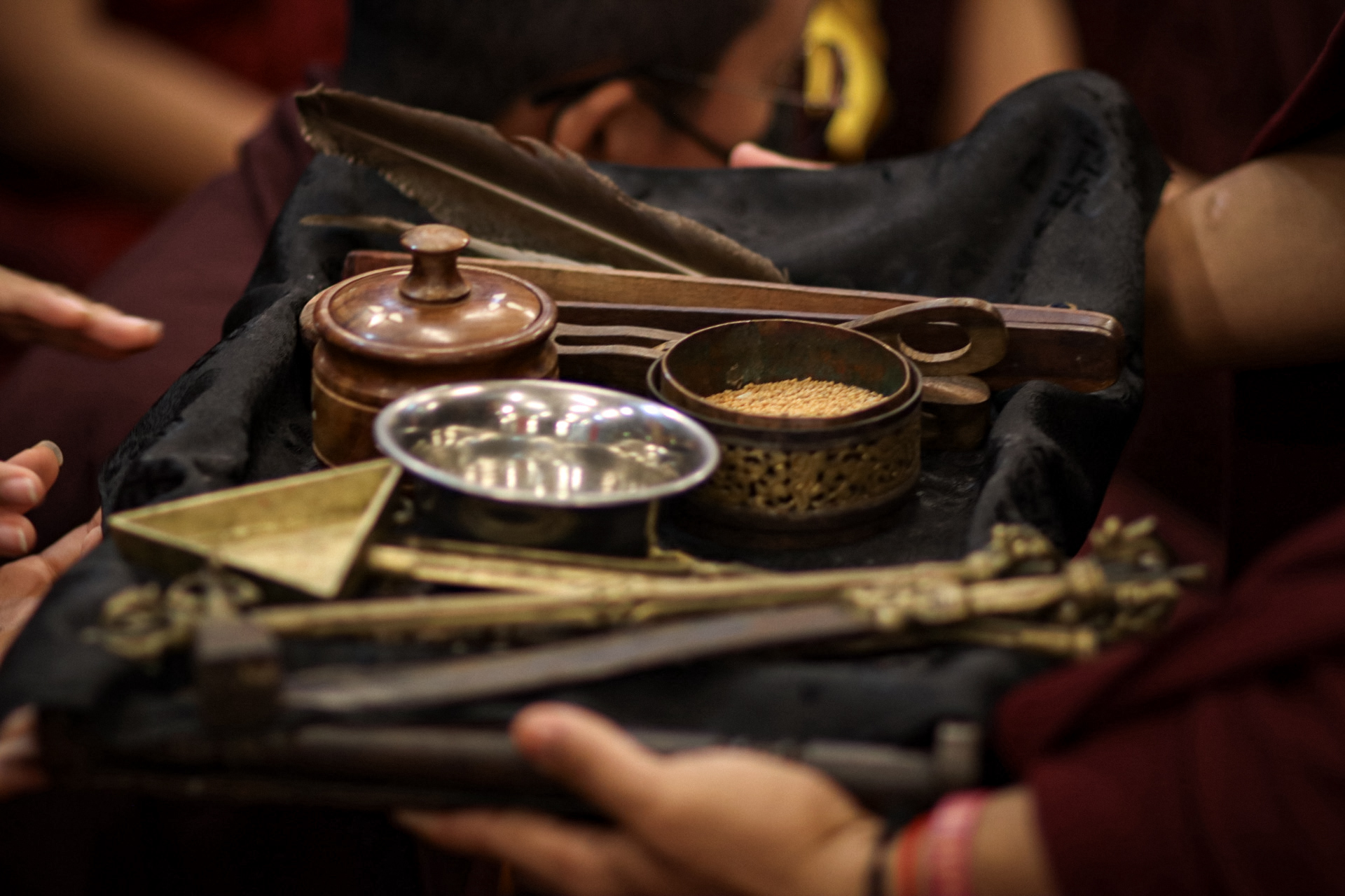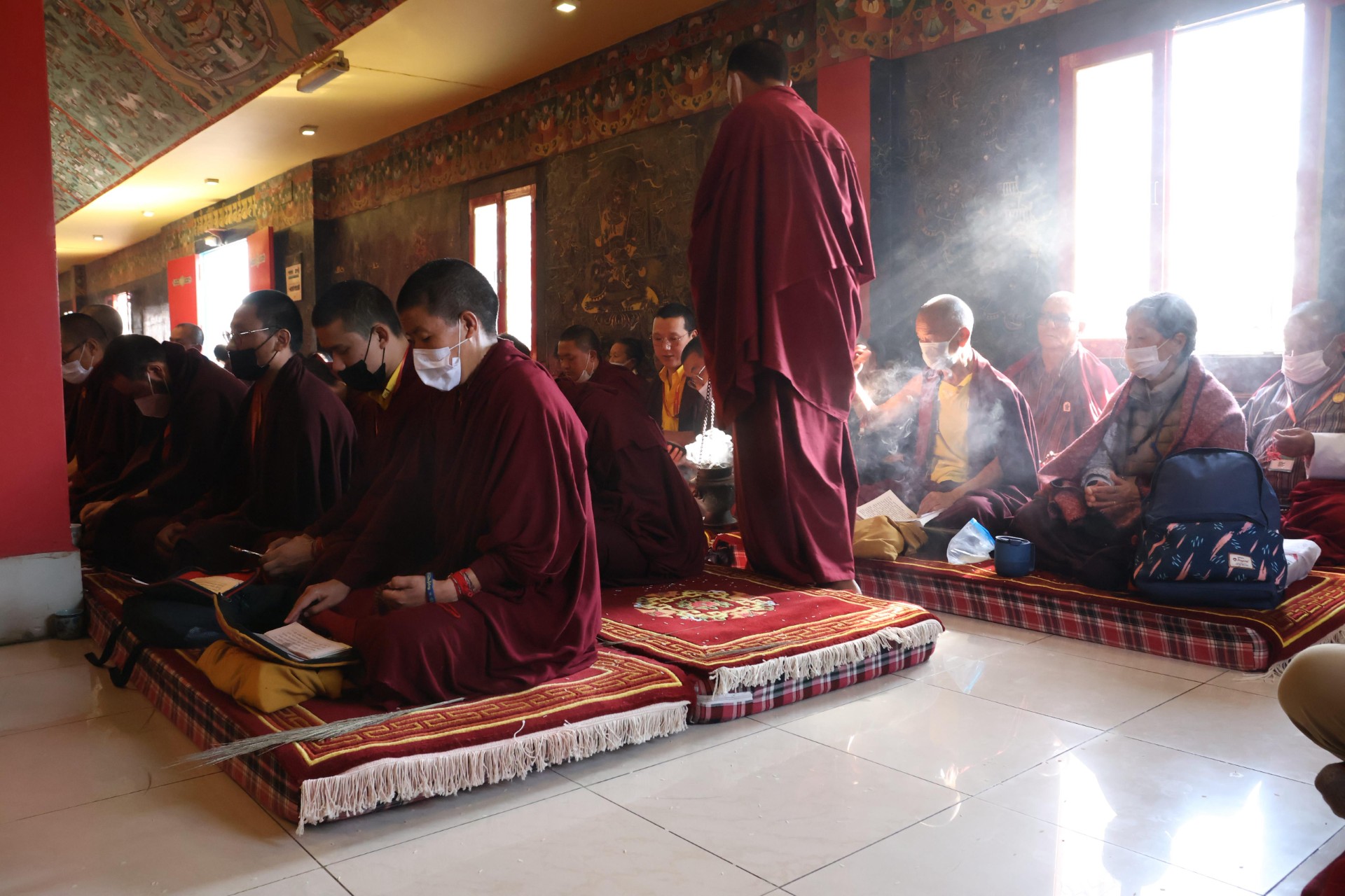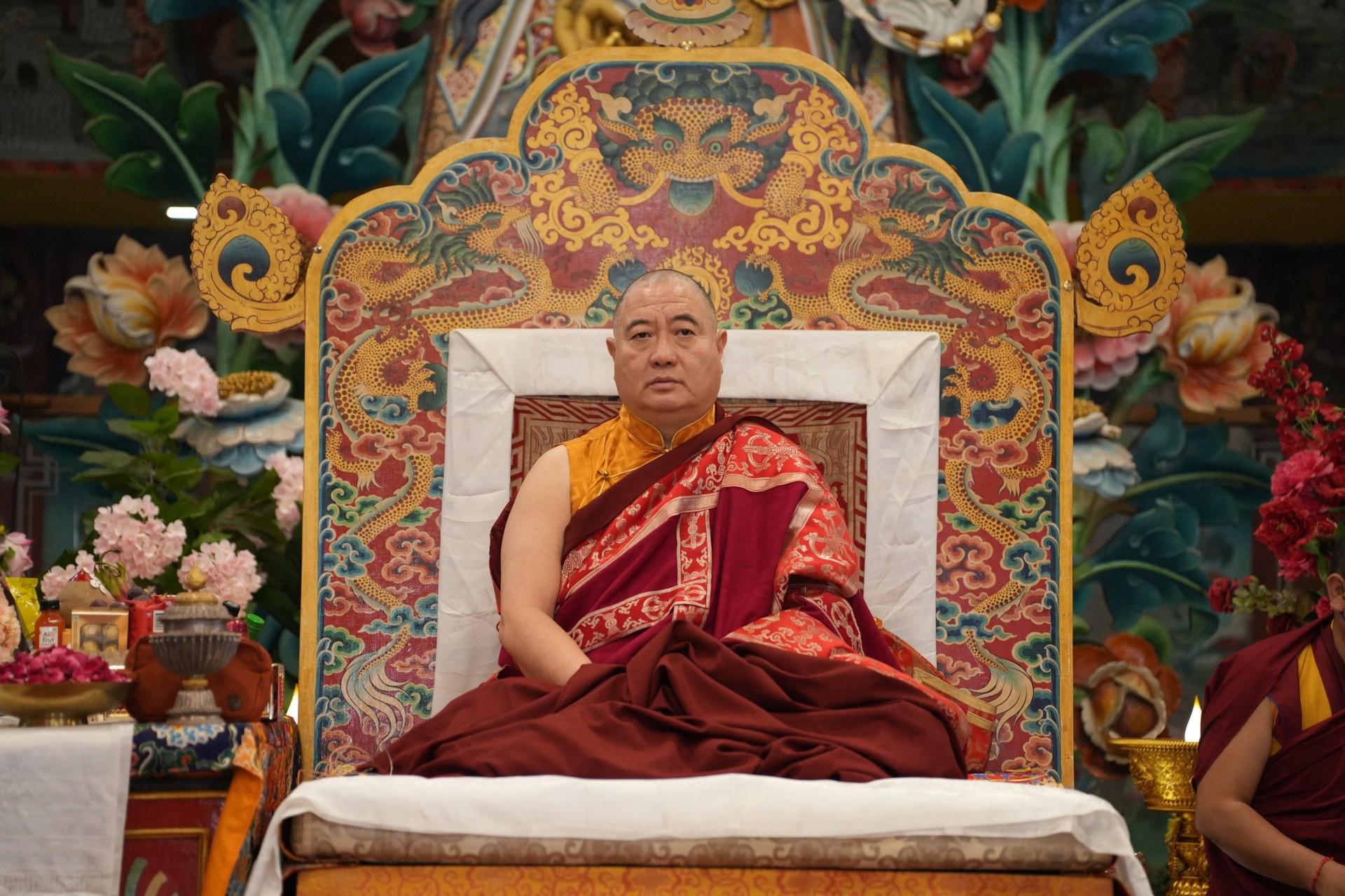 During these afternoon sessions, the young generation of teachers, yangsis, and tulkus performed the wangdrim, bestowing the empowerment articles to each person in the assembled sangha.
