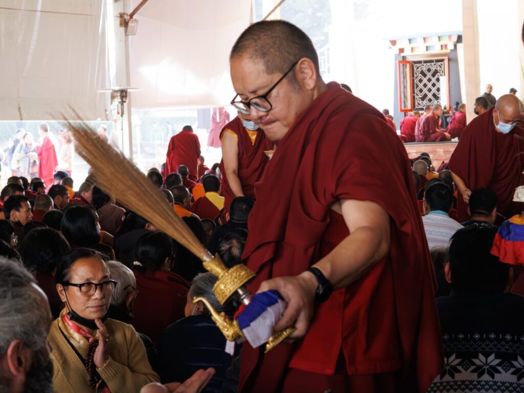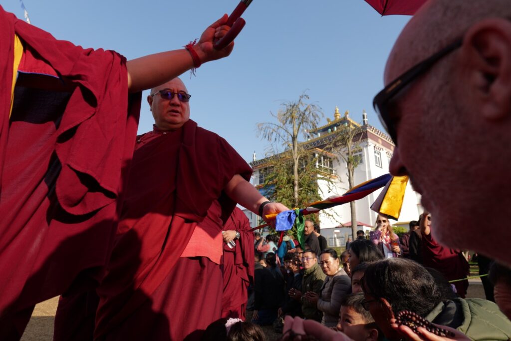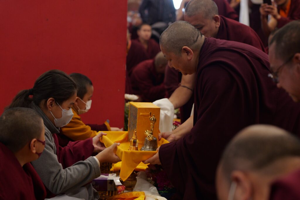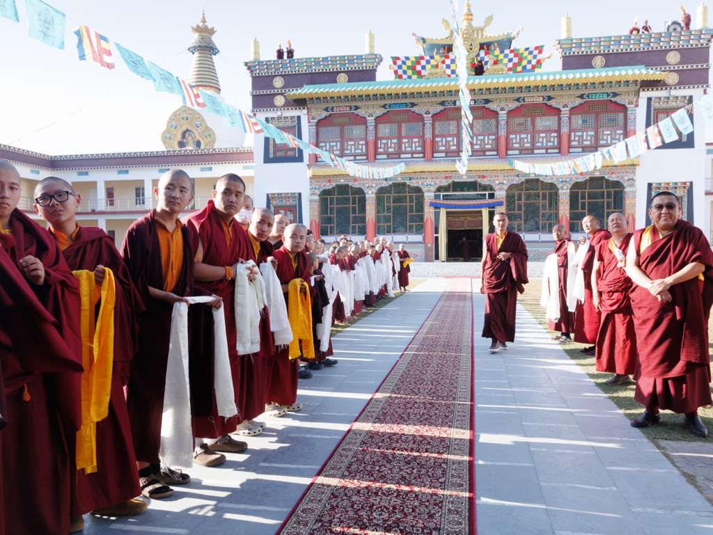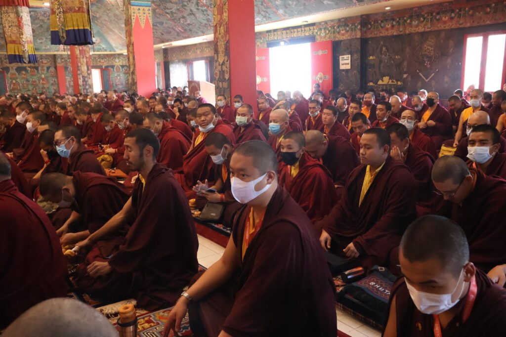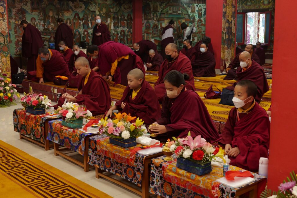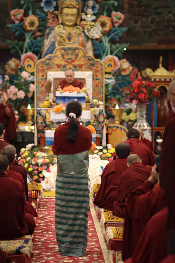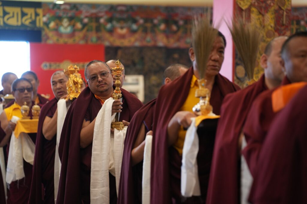 In the morning heartfelt gratitude was expressed to all those who made the transmissions possible, acknowledging the contribution of every individual – from the principal Mindrolling Administrators and Kama Organizers, to the teams of monks, nuns, and Western sangha, as well as all the staff members working hard in the kitchen, security, housekeeping, gardening, together with electricians, plumbers and carpenters. Special appreciation was also extended to the audio-visual team, whose dedicated efforts enabled the connection of spaces within the monastery and made several sessions accessible online to the worldwide sangha.