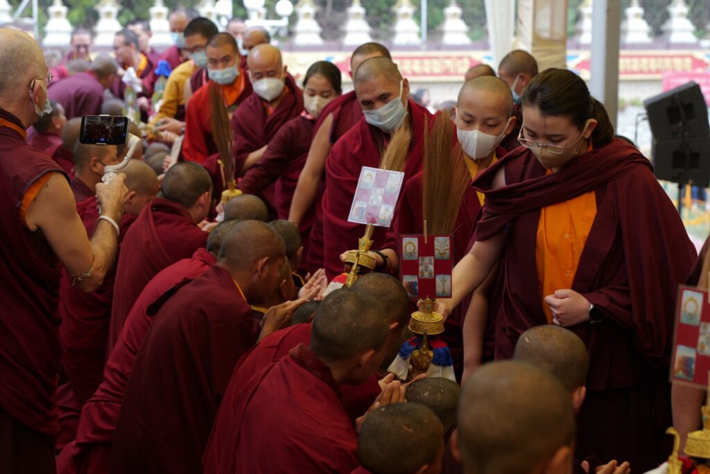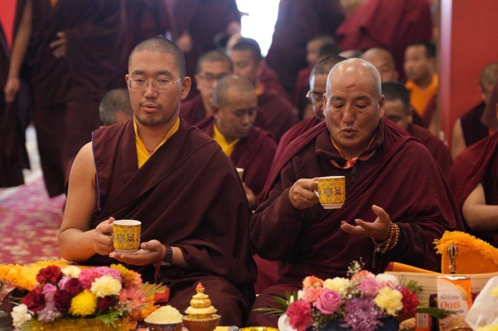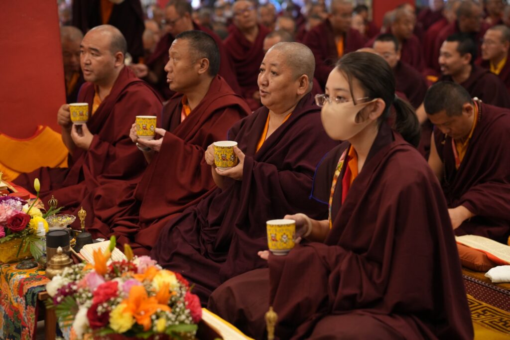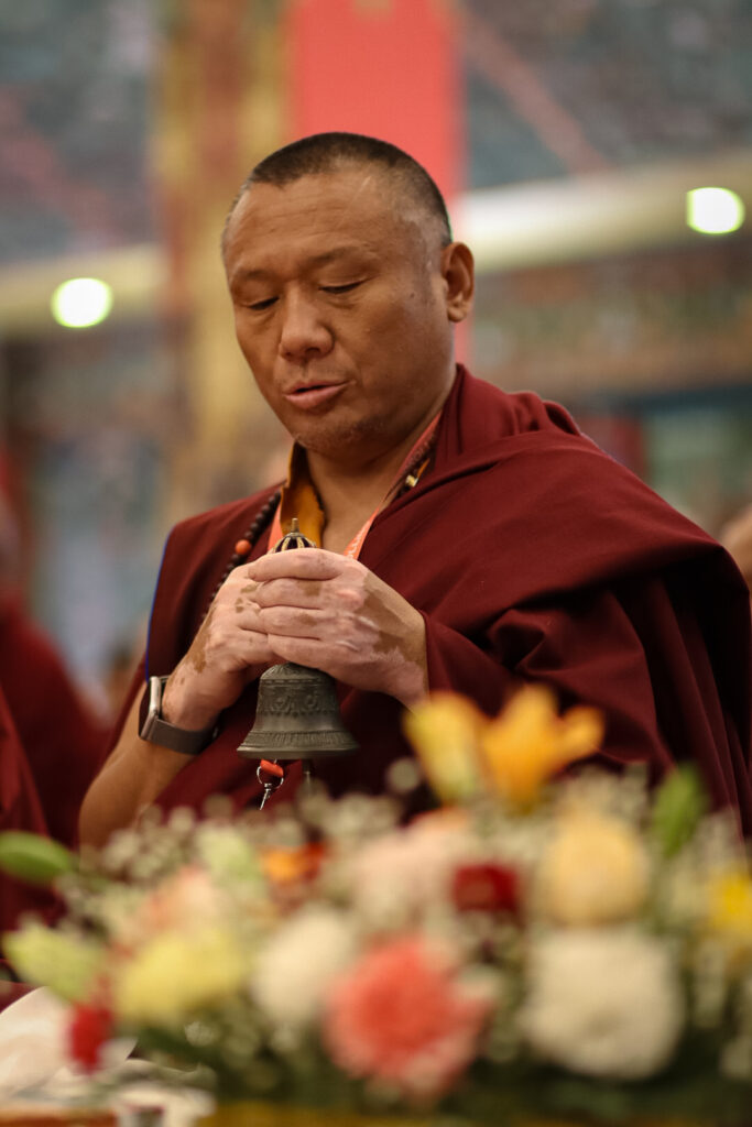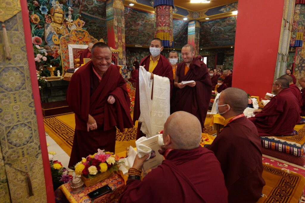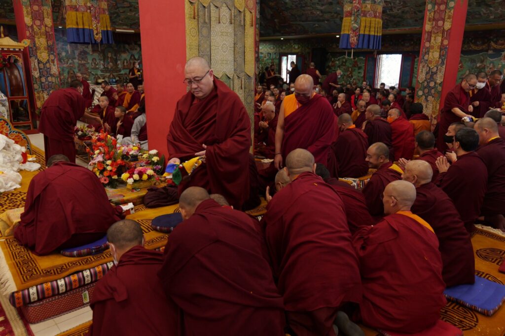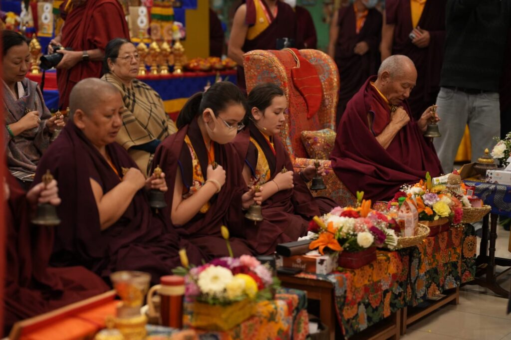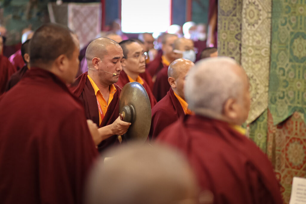 In the morning heartfelt gratitude was expressed to all those who made the transmissions possible, acknowledging the contribution of every individual – from the principal Mindrolling Administrators and Kama Organizers, to the teams of monks, nuns, and Western sangha, as well as all the staff members working hard in the kitchen, security, housekeeping, gardening, together with electricians, plumbers and carpenters. Special appreciation was also extended to the audio-visual team, whose dedicated efforts enabled the connection of spaces within the monastery and made several sessions accessible online to the worldwide sangha.