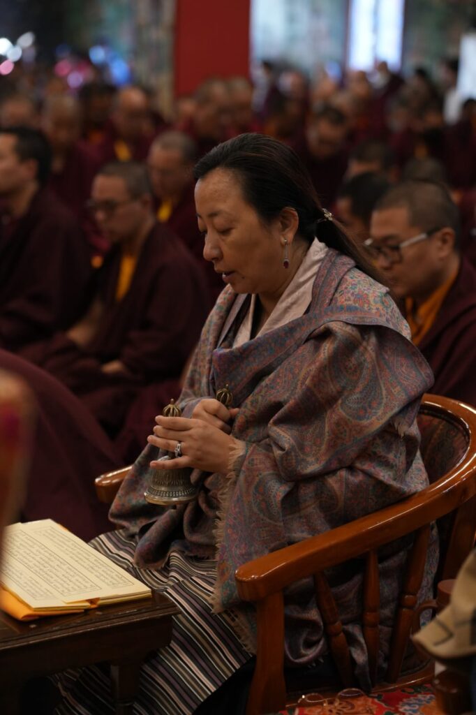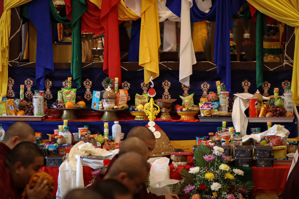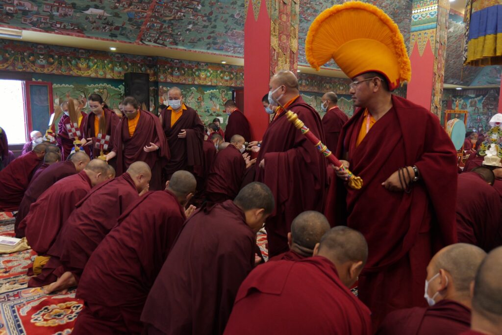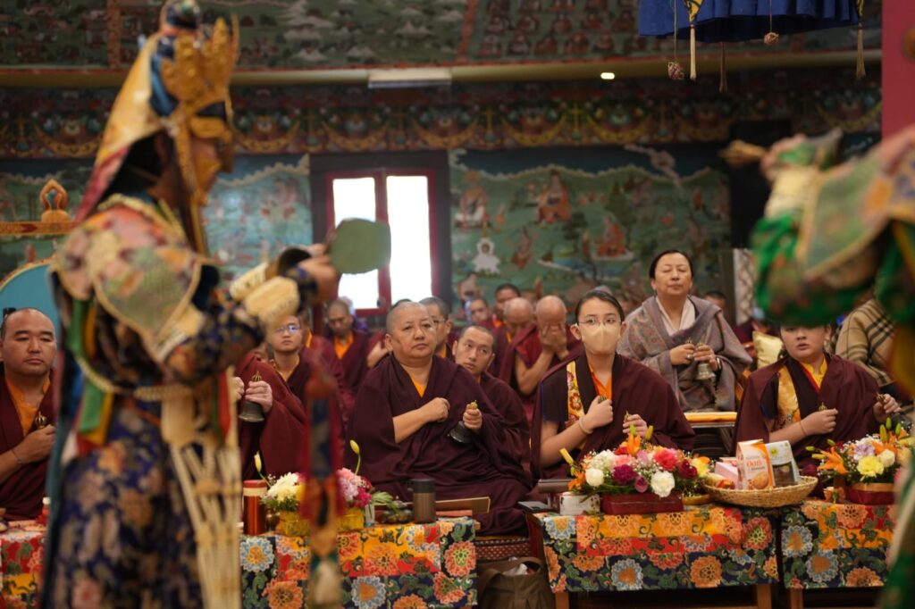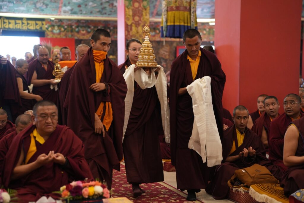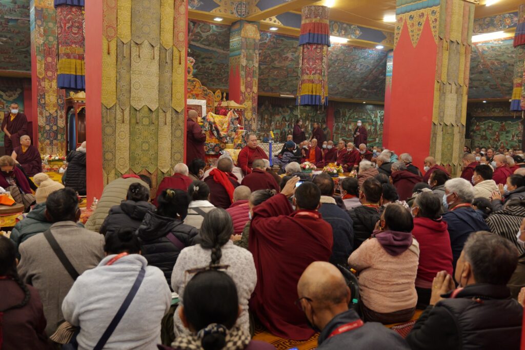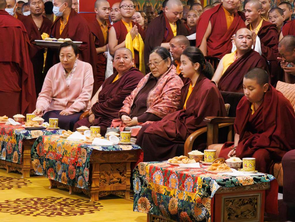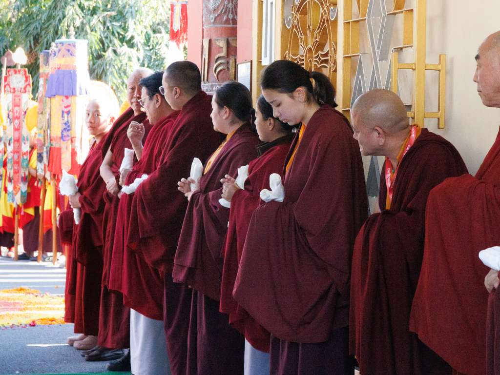 In the morning heartfelt gratitude was expressed to all those who made the transmissions possible, acknowledging the contribution of every individual – from the principal Mindrolling Administrators and Kama Organizers, to the teams of monks, nuns, and Western sangha, as well as all the staff members working hard in the kitchen, security, housekeeping, gardening, together with electricians, plumbers and carpenters. Special appreciation was also extended to the audio-visual team, whose dedicated efforts enabled the connection of spaces within the monastery and made several sessions accessible online to the worldwide sangha.