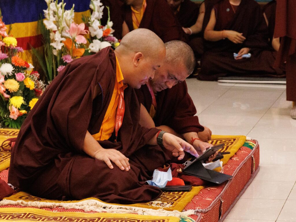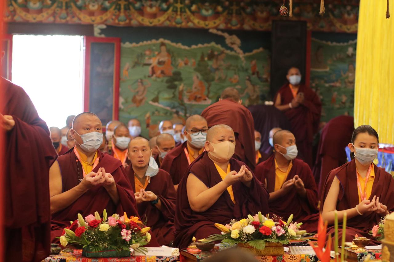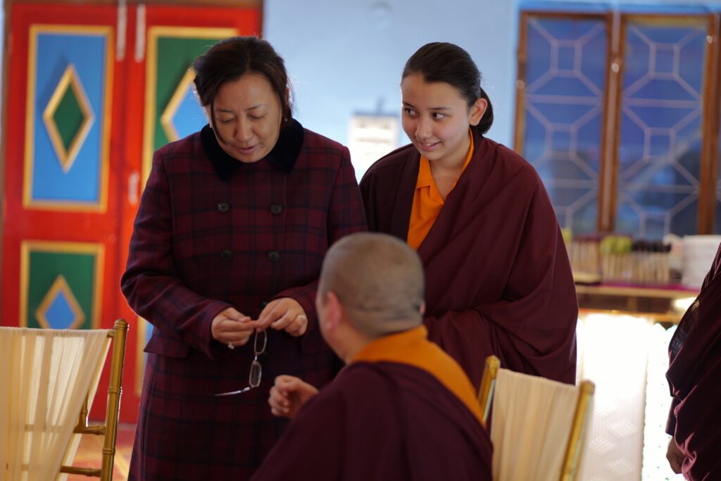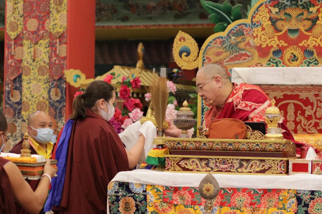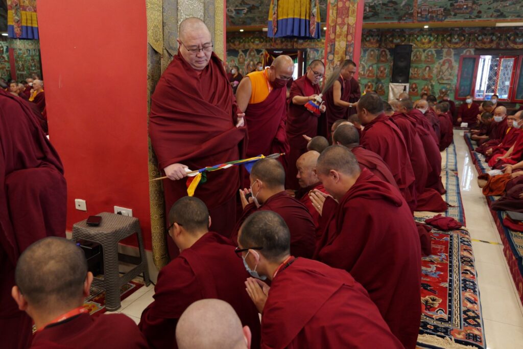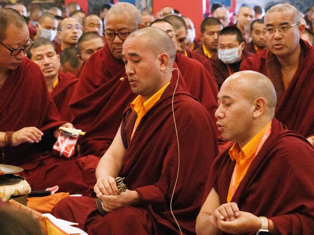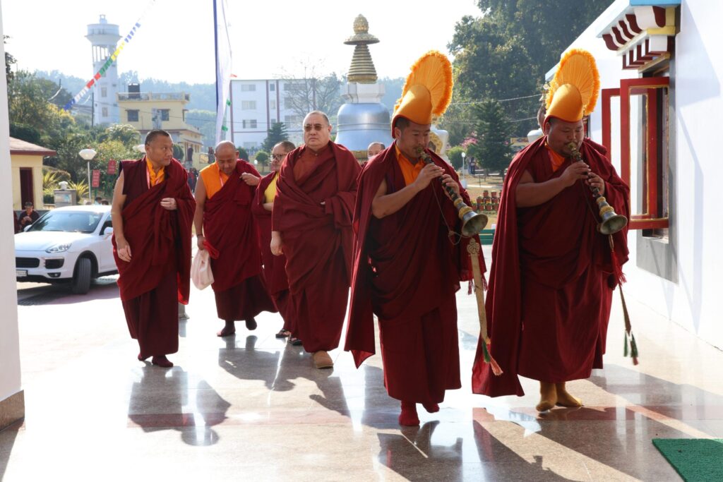In the morning heartfelt gratitude was expressed to all those who made the transmissions possible, acknowledging the contribution of every individual – from the principal Mindrolling Administrators and Kama Organizers, to the teams of monks, nuns, and Western sangha, as well as all the staff members working hard in the kitchen, security, housekeeping, gardening, together with electricians, plumbers and carpenters. Special appreciation was also extended to the audio-visual team, whose dedicated efforts enabled the connection of spaces within the monastery and made several sessions accessible online to the worldwide sangha.