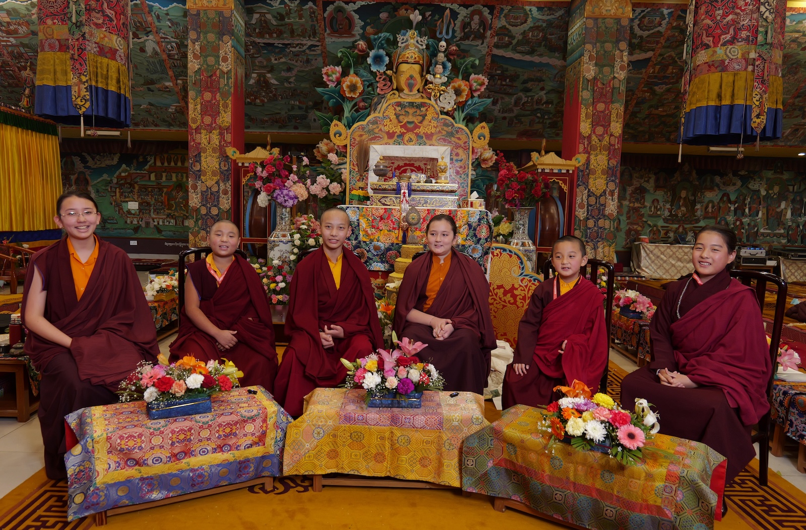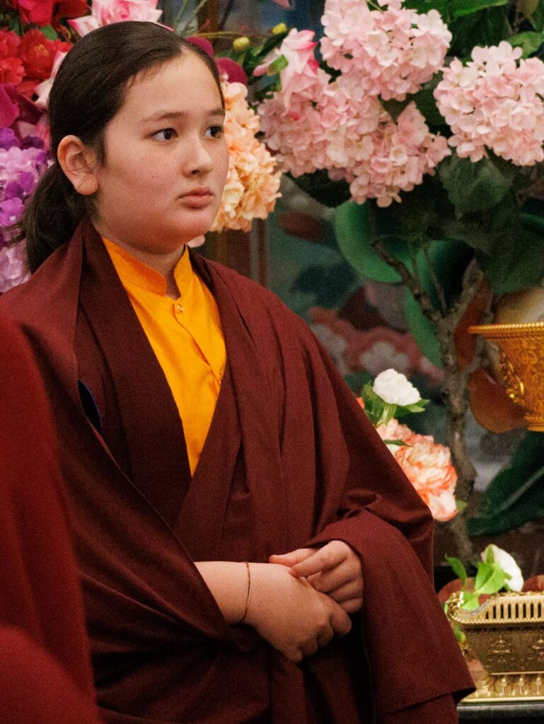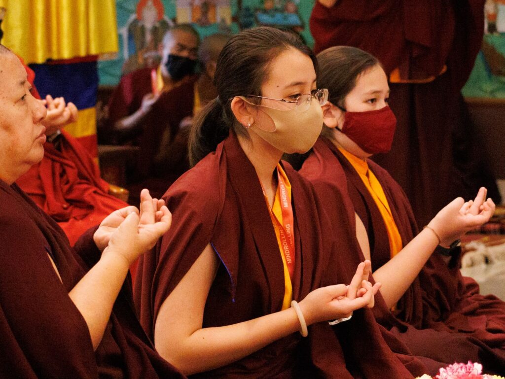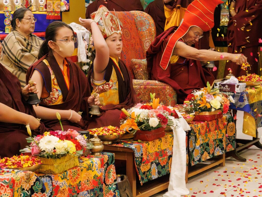 As the transmissions reached the section of the higher tantras, the young tulkus auspiciously bestowed the wangdrim all together. In a moment of historical significance, Minling Jetsün Rinpoche also joined the bestowal of the wangdrim, which was a most auspicious occasion, as in the history of the Dharma the Minling Jetsünmas have played a pivotal role in the preservation, protection, and continuation of the teachings.