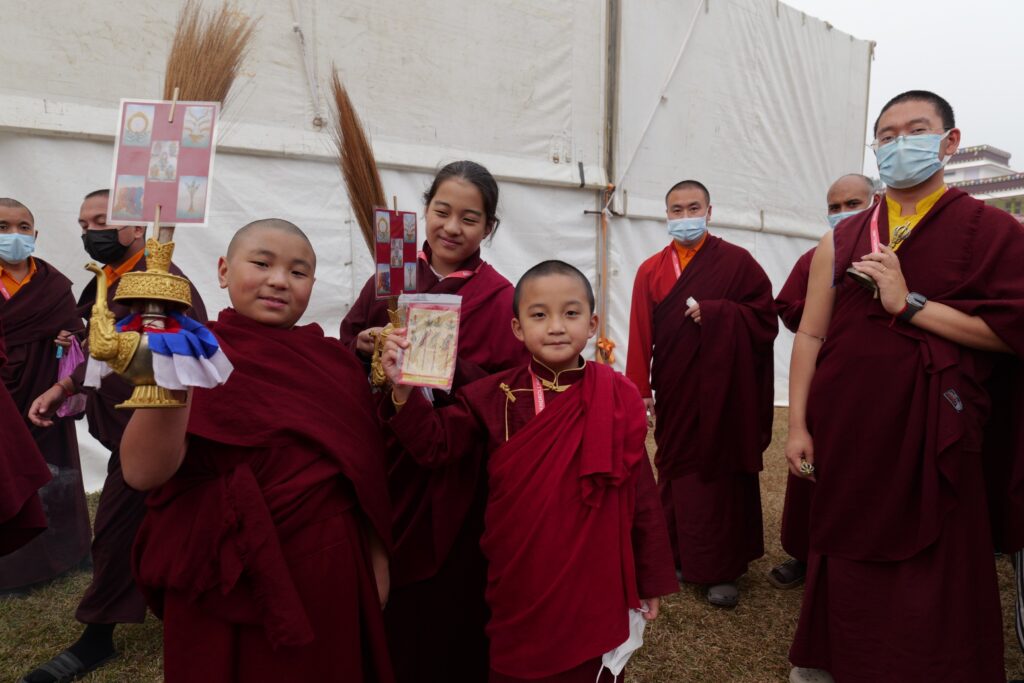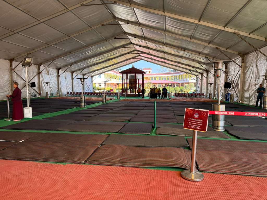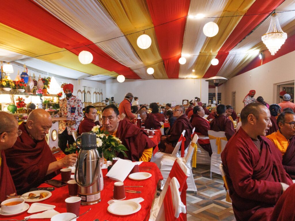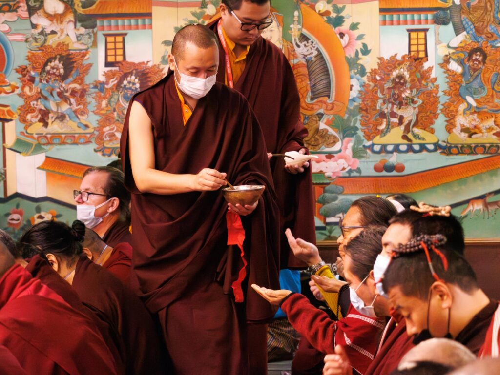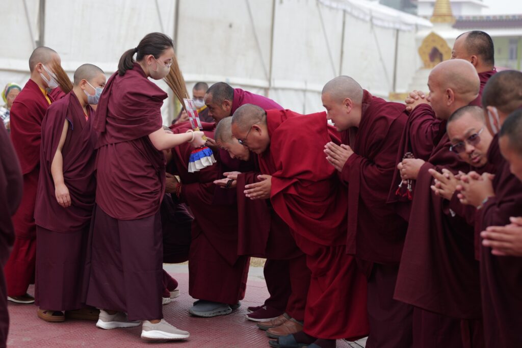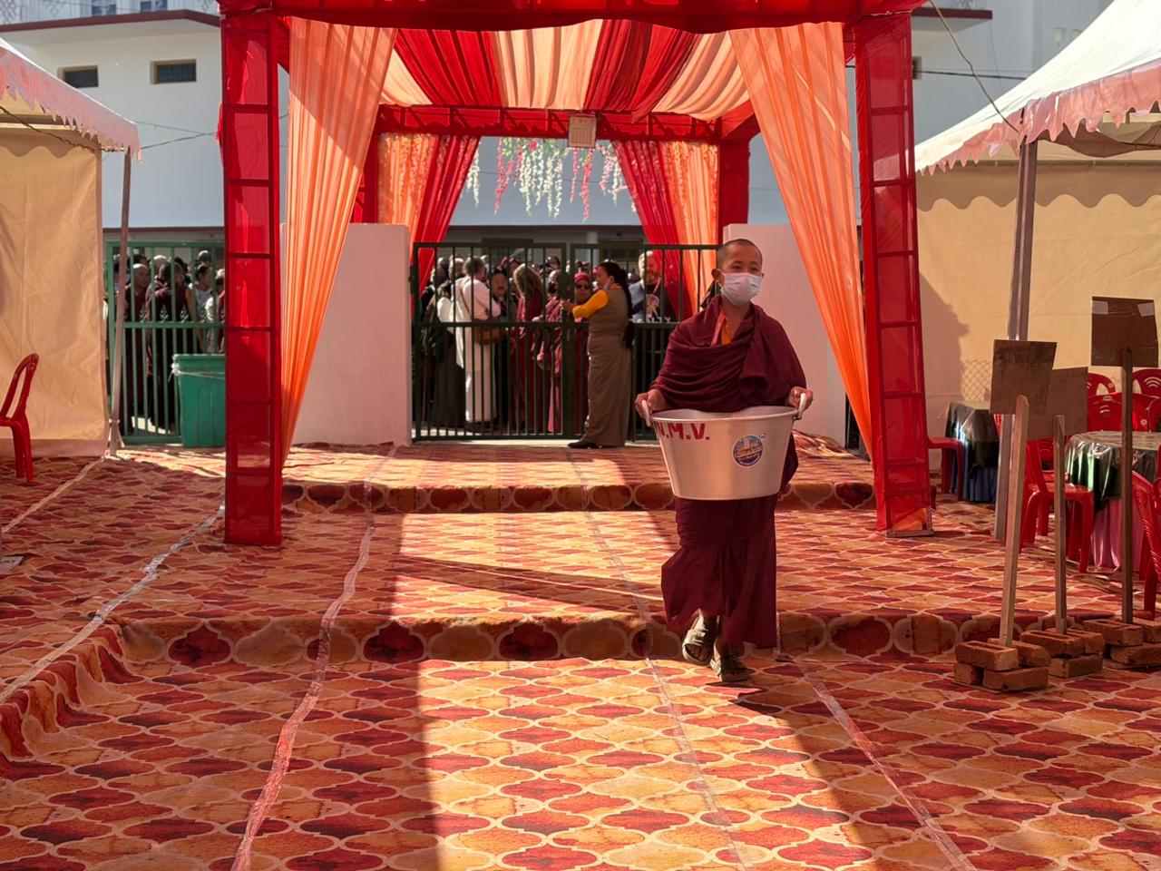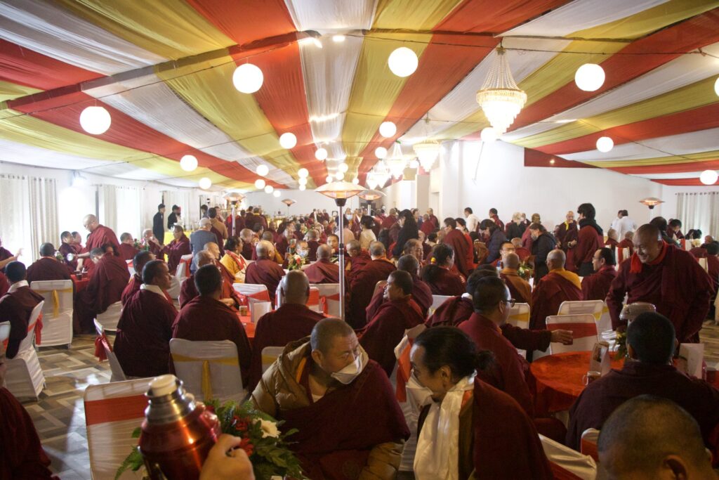 The monastery premises went through extensive renovations and preparations to host the transmissions. The Great World Peace Stupa was renovated, and a tent to cover the thousands of gathered practitioners was erected. To host the thousands of dharma practitioners, the monastery rooms were made available for the incoming guests, any larger spaces were turned into dormitories; and the young monk’s school and sports hall were repurposed to serve as dining venues. With gentle ease and adaptability, the monks worked to transform every corner of the monastery to fulfill the needs of this extraordinary event and provide a warm, comfortable welcome to all the attendees.