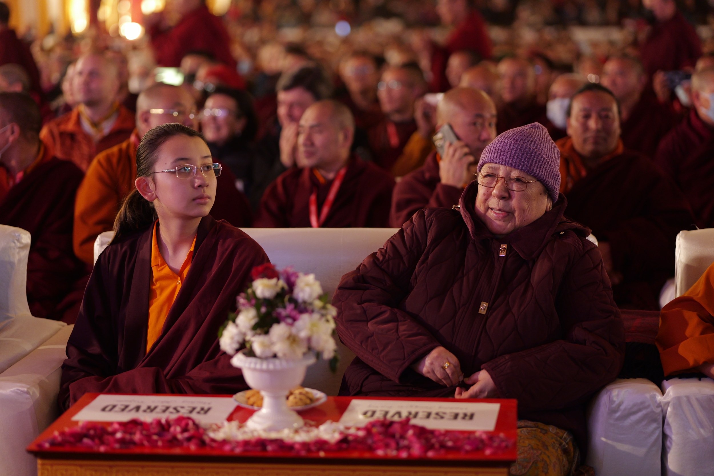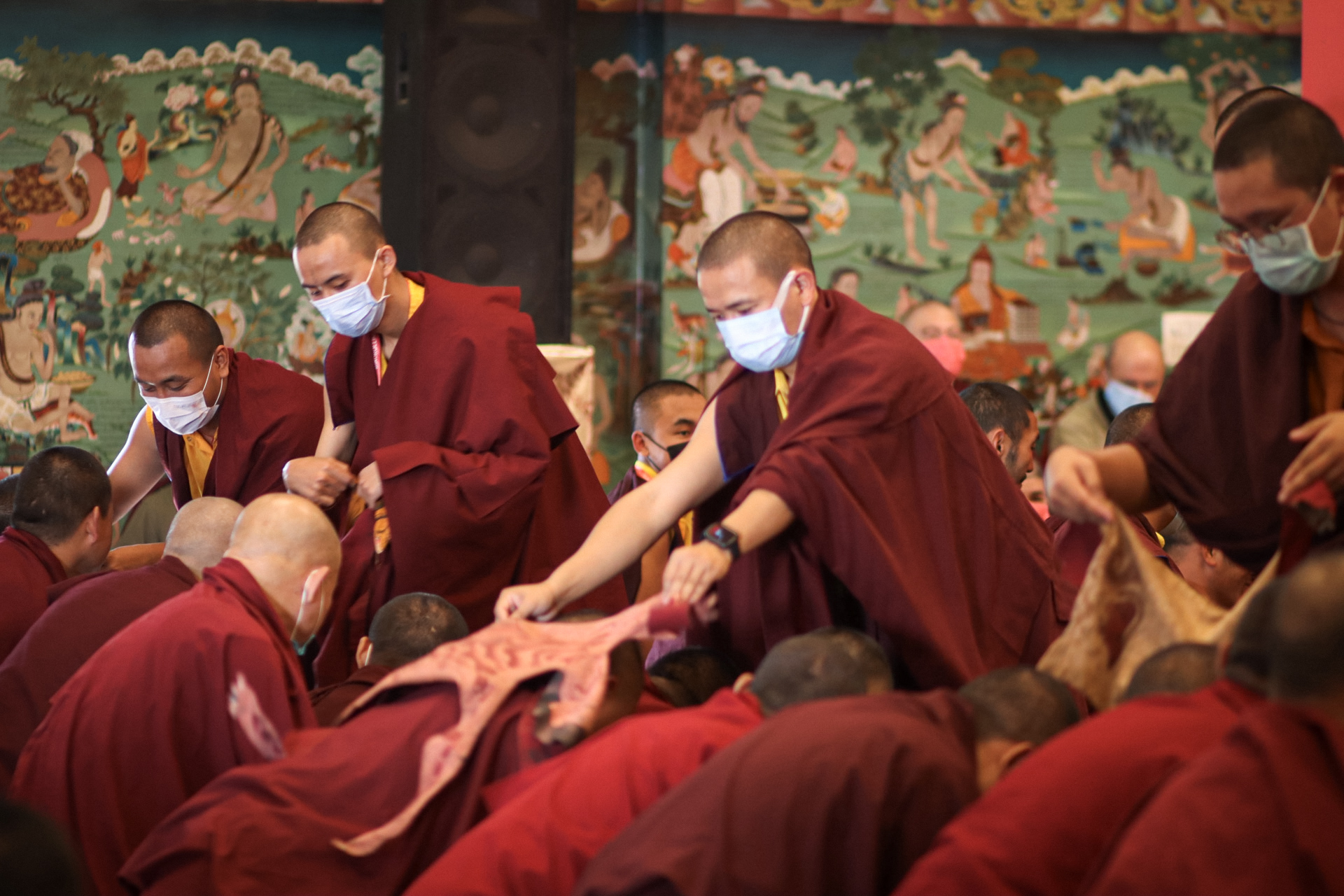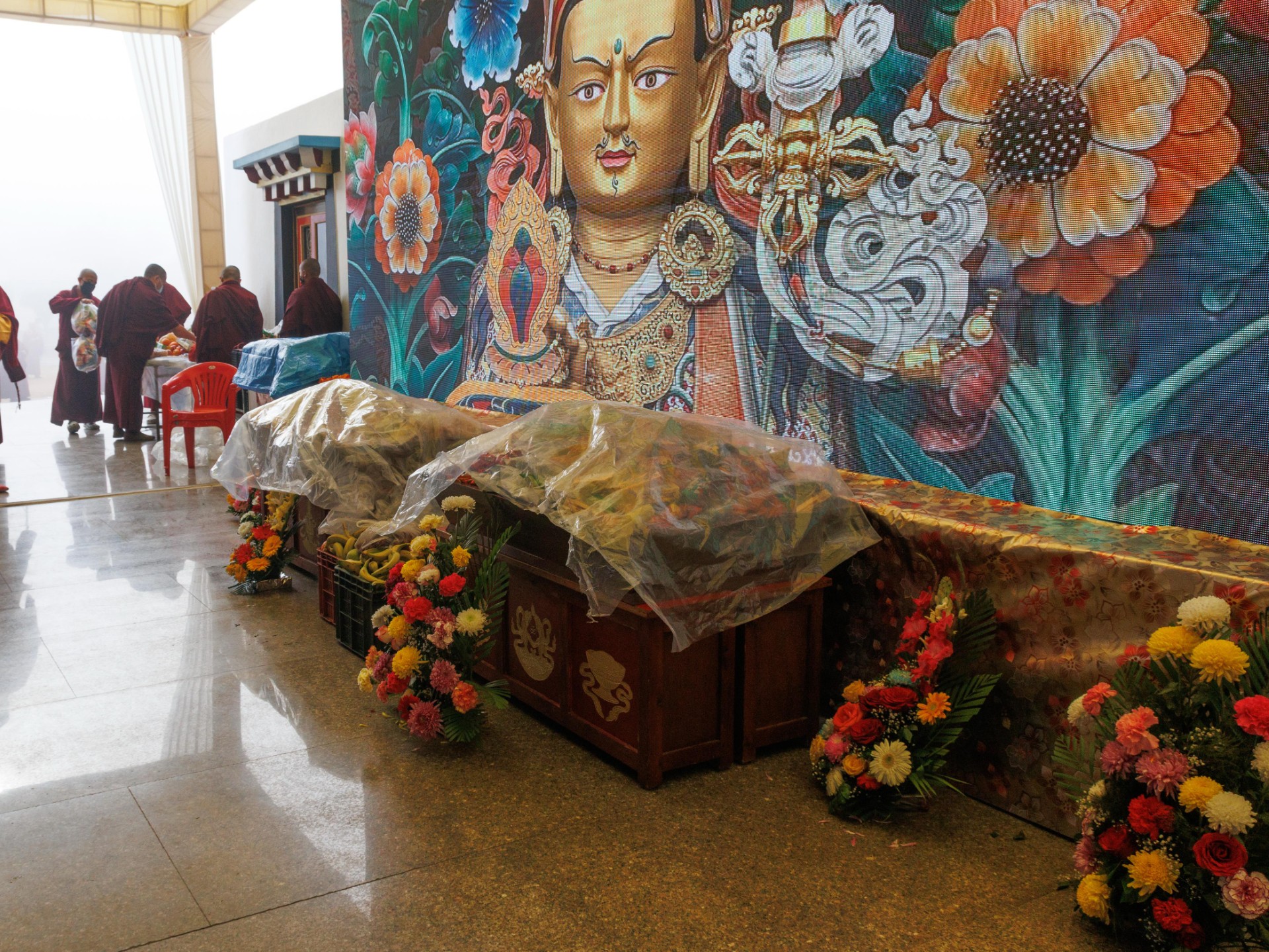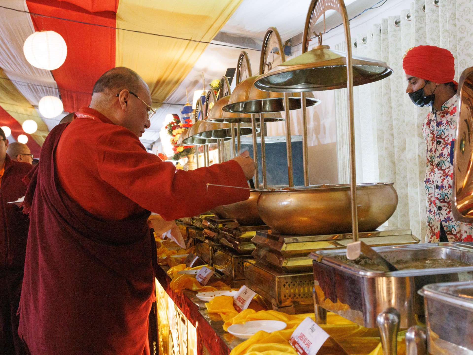 The monastery premises went through extensive renovations and preparations to host the transmissions. The Great World Peace Stupa was renovated, and a tent to cover the thousands of gathered practitioners was erected. To host the thousands of dharma practitioners, the monastery rooms were made available for the incoming guests, any larger spaces were turned into dormitories; and the young monk’s school and sports hall were repurposed to serve as dining venues. With gentle ease and adaptability, the monks worked to transform every corner of the monastery to fulfill the needs of this extraordinary event and provide a warm, comfortable welcome to all the attendees.