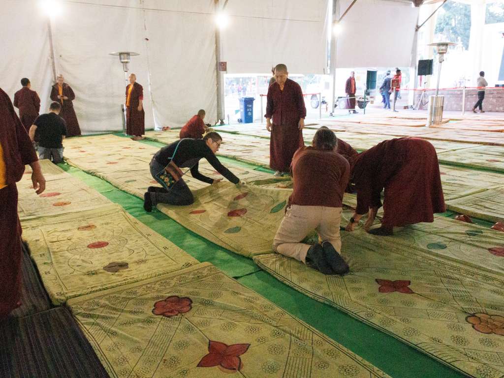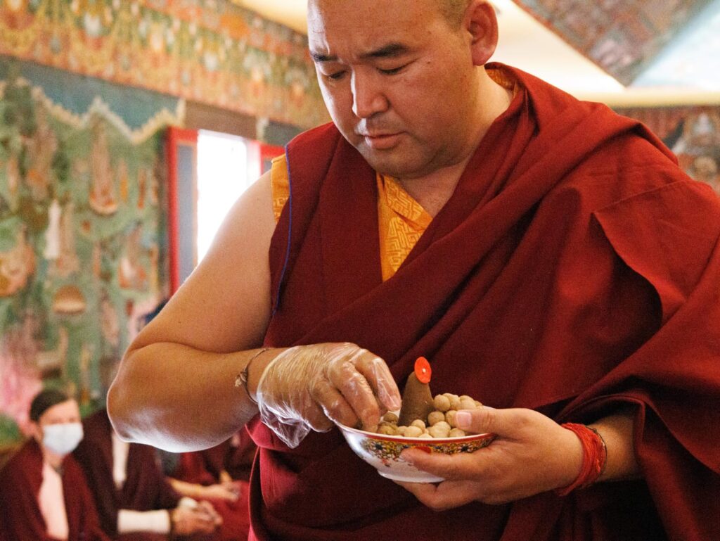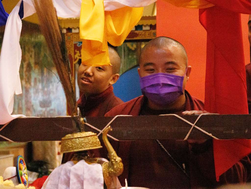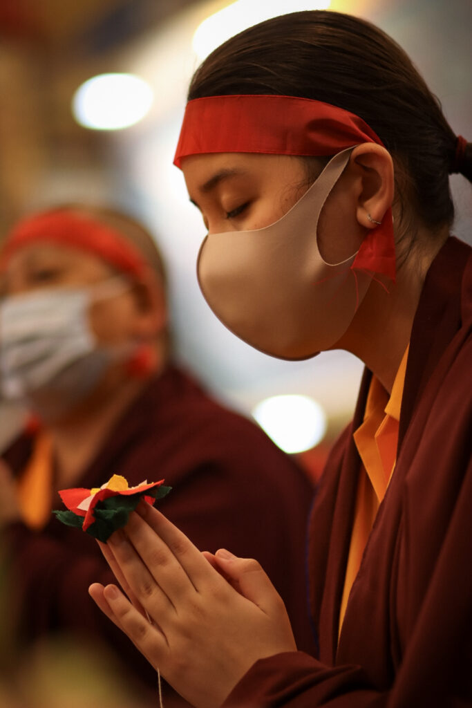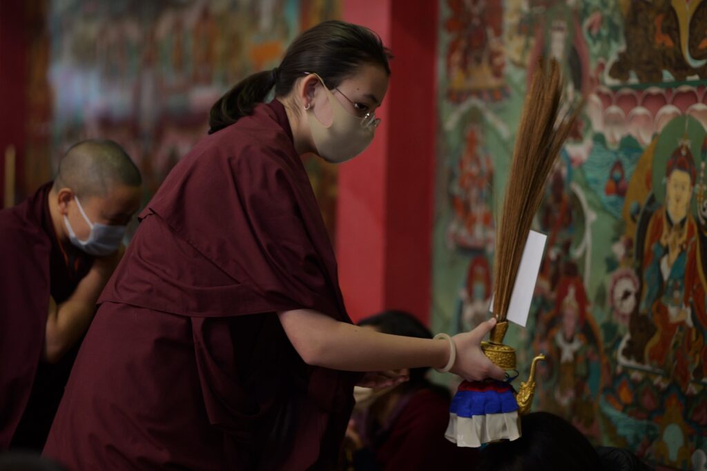 At the end of each day, the team of jedrang monks, Samten Tse nuns, and volunteers from the Mindrolling International sangha, thoroughly cleaned the space of the stupa shrine room and transmission tent, replenishing flower offerings and ensuring an uplifted, respectful, and beautiful environment.