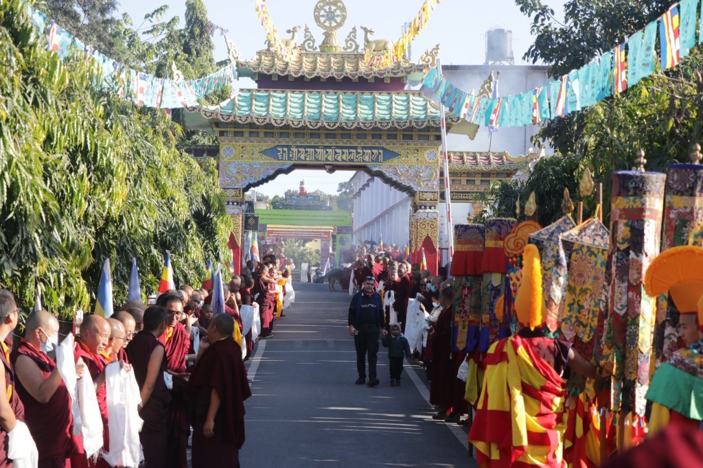 On November 28th, Mindrolling Monastery was blessed with the arrival of Kyabje Sechen Rabjam Rinpoche who was welcomed by all the great masters, rinpoches, yangsis, tulkus, khenpos, monks, nuns, ngakpas, and a vast gathering of devoted practitioners. As the multicolored cloth banner hung proclaiming the highest honor of Kyabje Rinpoche’s arrival, the gong, gyaling, and dungchen resounded, and the formal welcoming procession for Kyabje Rabjam Rinpoche entered the monastery grounds.