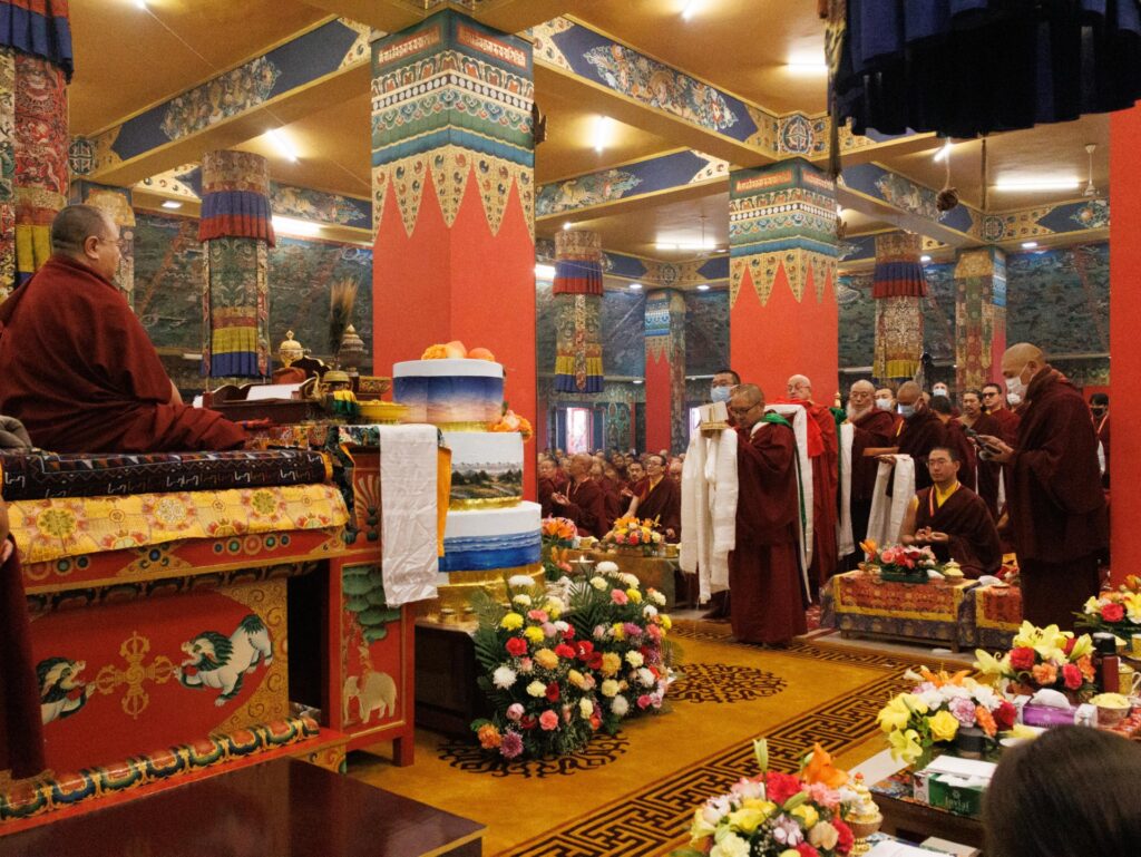 On the 25th of December, the birthday of Shechen Rabjam Rinpoche was joyfully celebrated by the gathered rinpoches, monks, and nuns and the lay sangha. In the shrine room a grand birthday cake was brought forth. Following the prayers and supplications, vast offerings of mandala and tensum were made several times. The offering by Mindrolling Monastery was made by the young rinpoches and Mindrolling masters. This was followed by Shechen Monastery, who supplicated for Kyabje Rinpoche’s long life with mandala offering and tensum.