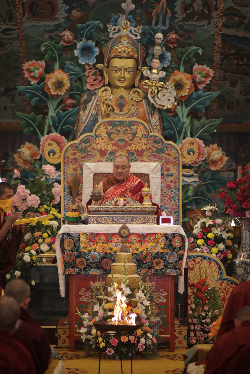 At the conclusion of the sacred Kama transmissions at Mindrolling Monastery, a traditional tenzhug, a long-life offering ceremony, was respectfully and joyfully offered for the long life of Kyabje ShechenRabjam Rinpoche with immense gratitude and heartfelt supplications for Rinpoche’s long life and vast Dharma activities. Minling Dungse Rinpoche presided over the tenzhug performing the sacred ritual of making extensive offerings of symbolic representations of longevity and formal verses of supplication. The ceremony culminated with the vast mandala offering led by Minling Jetsün Rinpoche, followed by the great assembly of Mindrolling sangha who presented sacred offerings of body, speech, and mind representations, along with an abundant variety of exquisite offerings.