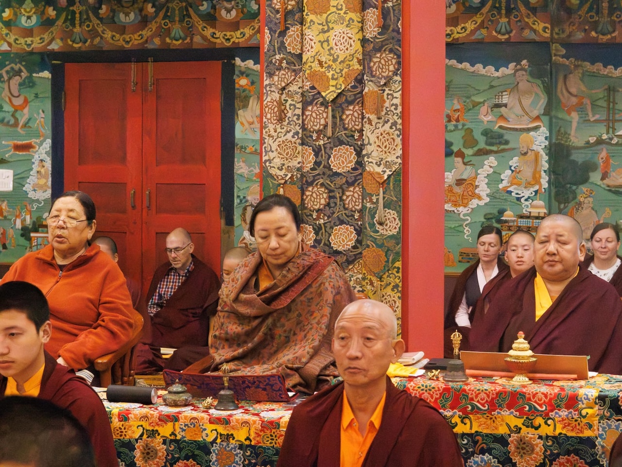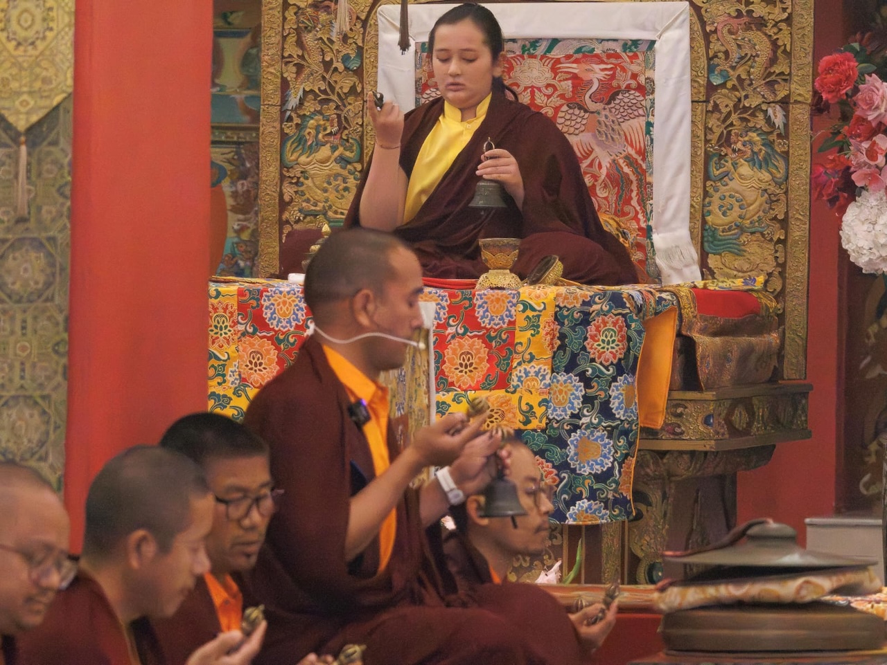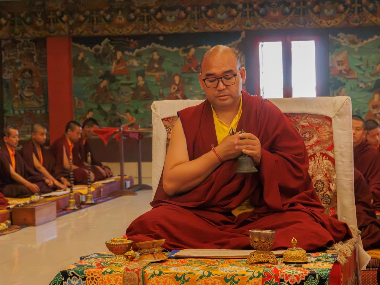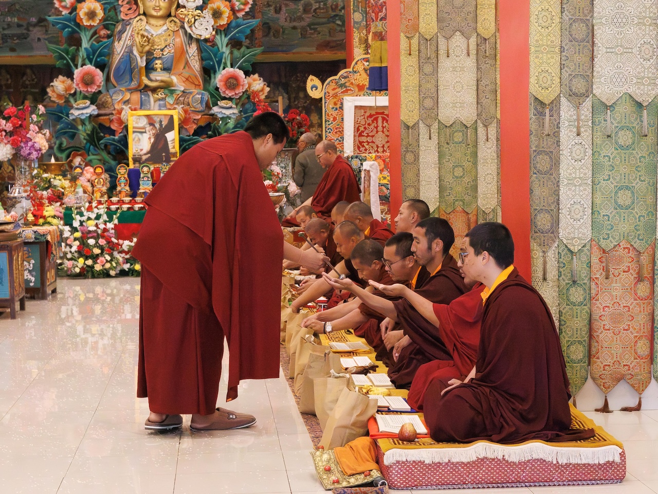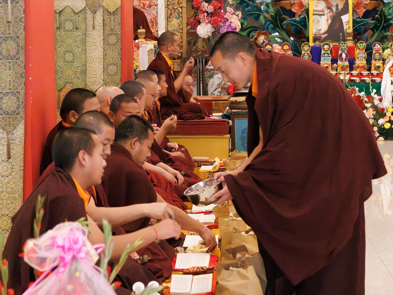 On the third day of Losar of the year of the Fire Horse, 2026, the sangha of Mindrolling gathered to make vast offerings of ganachakra (feast offerings) to mark the anniversary of the parinirvana of Kyabje Minling Trichen. The assembly was led by Minling Dungse Rinpoche and included Minling Jetsün Rinpoche, Minling Jetsün Khandro Rinpoche, Minling Jetsün Dechen Paldrön, Sangyum Kushog, Venerable Khentrul Marpa Rinpoche and the other Mindrolling tulkus, khenpos, and monks, as well as nuns of Samten Tse, and Mindrolling International sangha members. Many more sangha members who could not attend in person joined the practice on the internet by live stream. The entire assembly joined together with great devotion to accomplish the vast ganacakra.