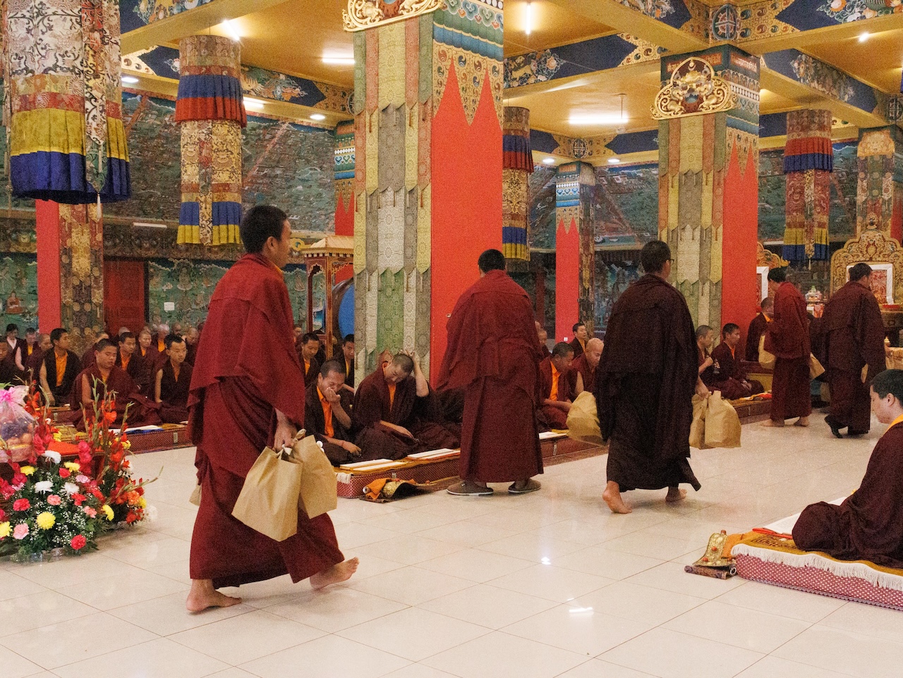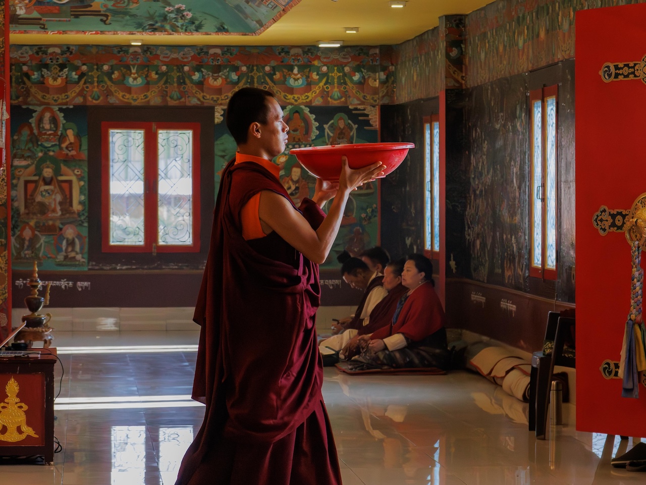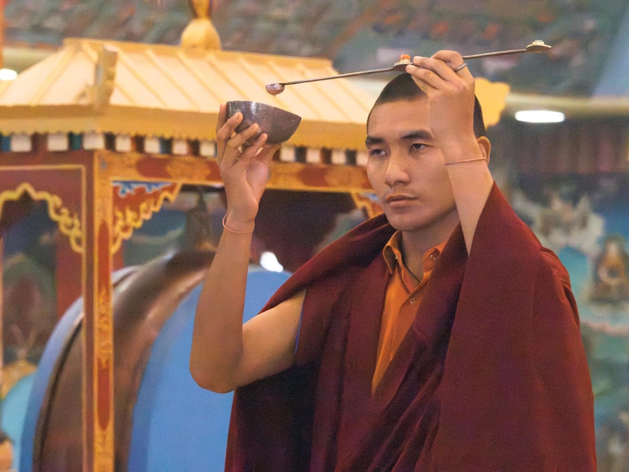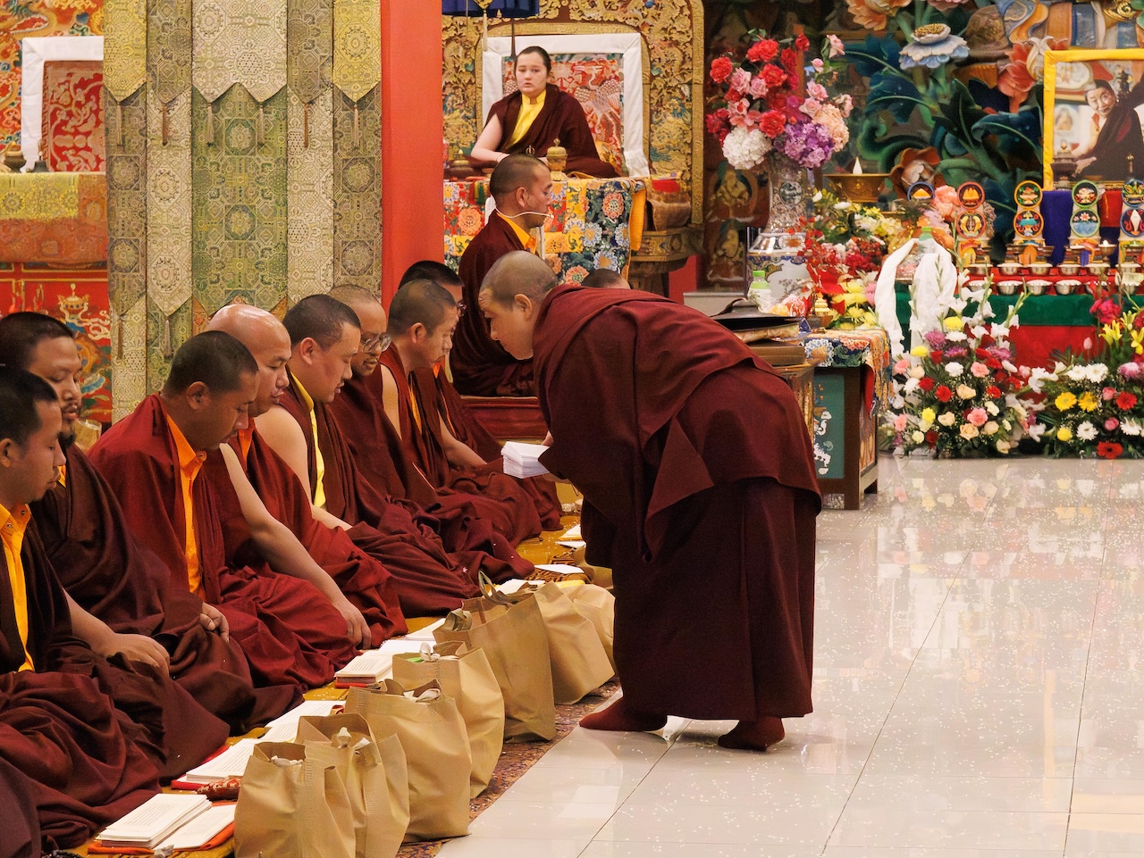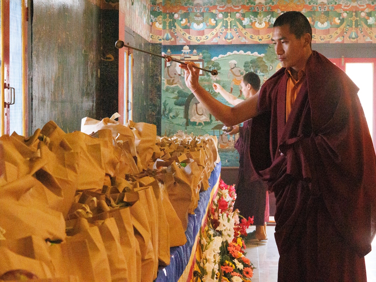 On the third day of Losar of the year of the Fire Horse, 2026, the sangha of Mindrolling gathered to make vast offerings of ganachakra (feast offerings) to mark the anniversary of the parinirvana of Kyabje Minling Trichen. The assembly was led by Minling Dungse Rinpoche and included Minling Jetsün Rinpoche, Minling Jetsün Khandro Rinpoche, Minling Jetsün Dechen Paldrön, Sangyum Kushog, Venerable Khentrul Marpa Rinpoche and the other Mindrolling tulkus, khenpos, and monks, as well as nuns of Samten Tse, and Mindrolling International sangha members. Many more sangha members who could not attend in person joined the practice on the internet by live stream. The entire assembly joined together with great devotion to accomplish the vast ganacakra.