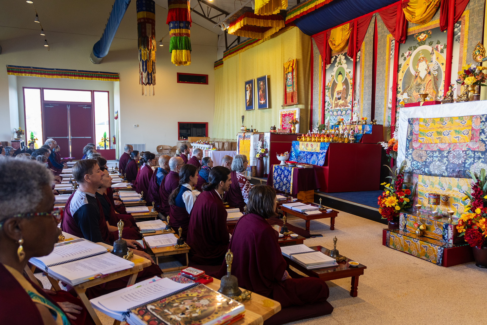 On November 22nd, the 10th day of the tenth month, the sangha celebrated the birthday of Minling Jetsün Dechen Paldrön. This auspicious day was marked with prayers and offerings dedicated to the long life and continued vast dharma activities of Minling Jetsünla. The sangha performed the Ridgzin Thugthig sadhana and made offerings of mandala and body, speech and mind with heartfelt gratitude and devotion.