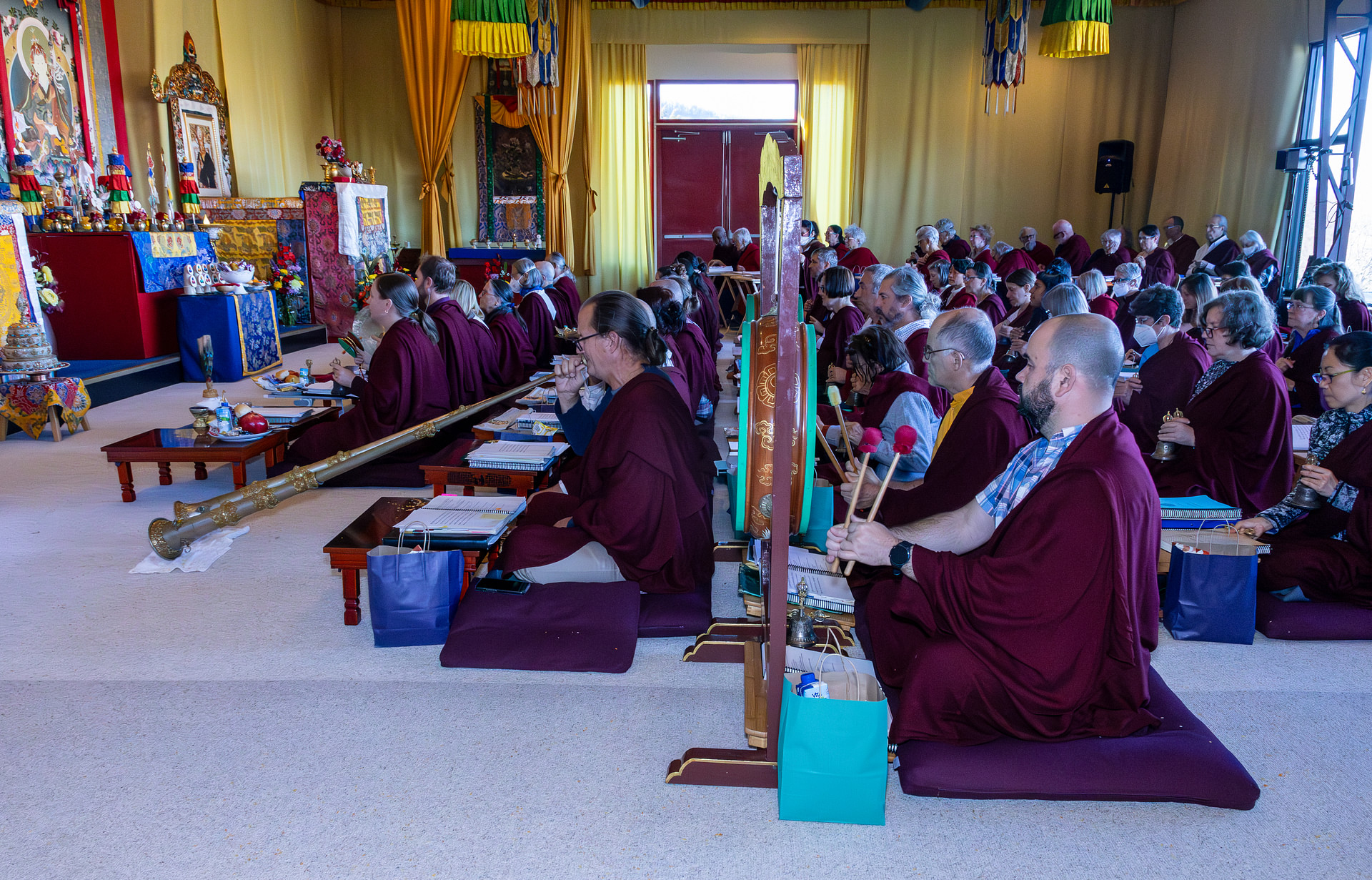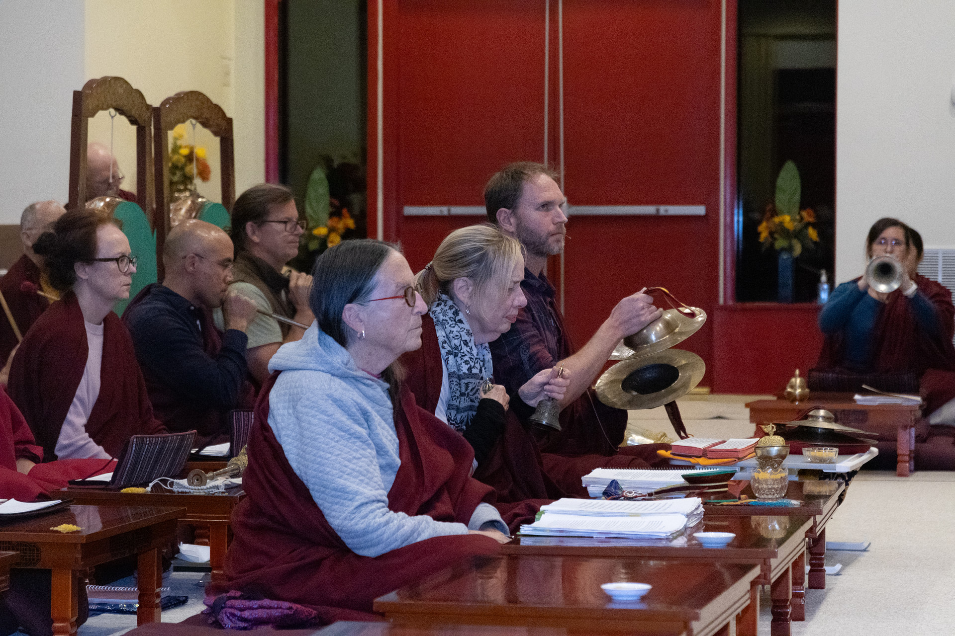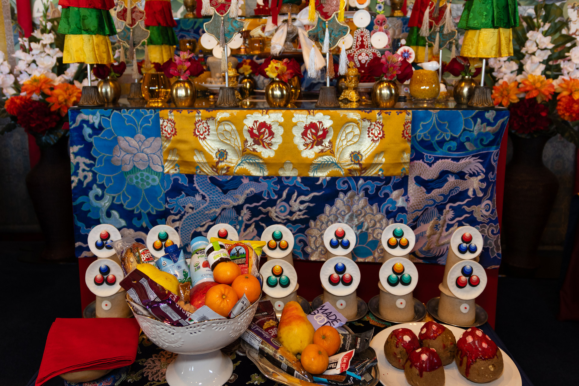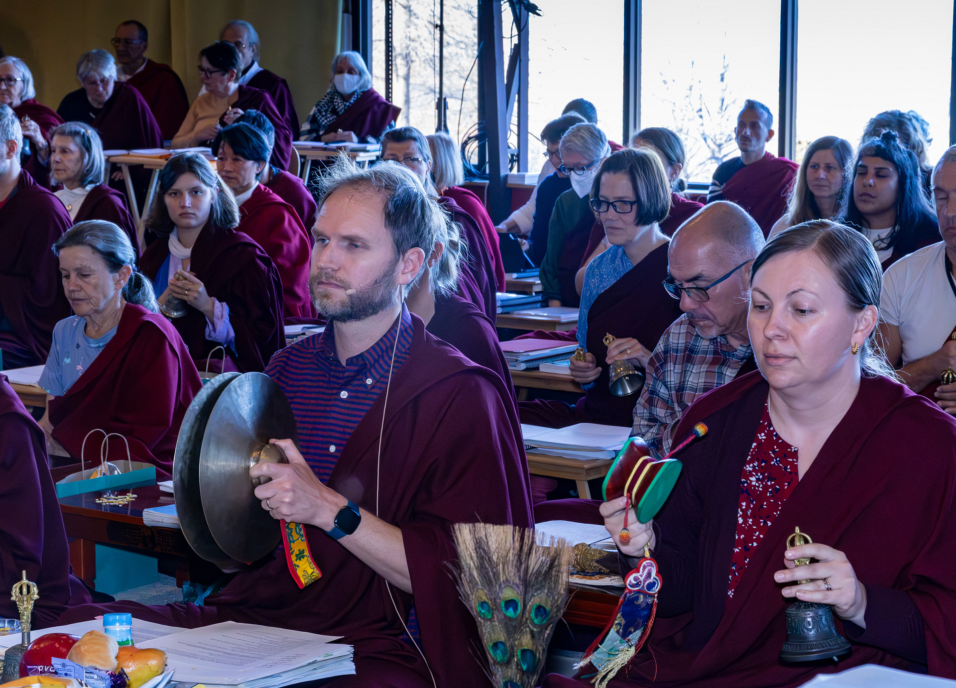 On the full moon day of November 27th, 2023, the sangha performed the Minling Dorsem sadhana as a concluding offering for this section of the retreat. Joining together all that had been taught throughout the retreat, the gathered assembly offered the feast with great joy and made extensive prayers and offerings with sincere aspirations for the flourishing and accomplishment of dharma, the continued presence and activity of our teachers, and peace in the world.